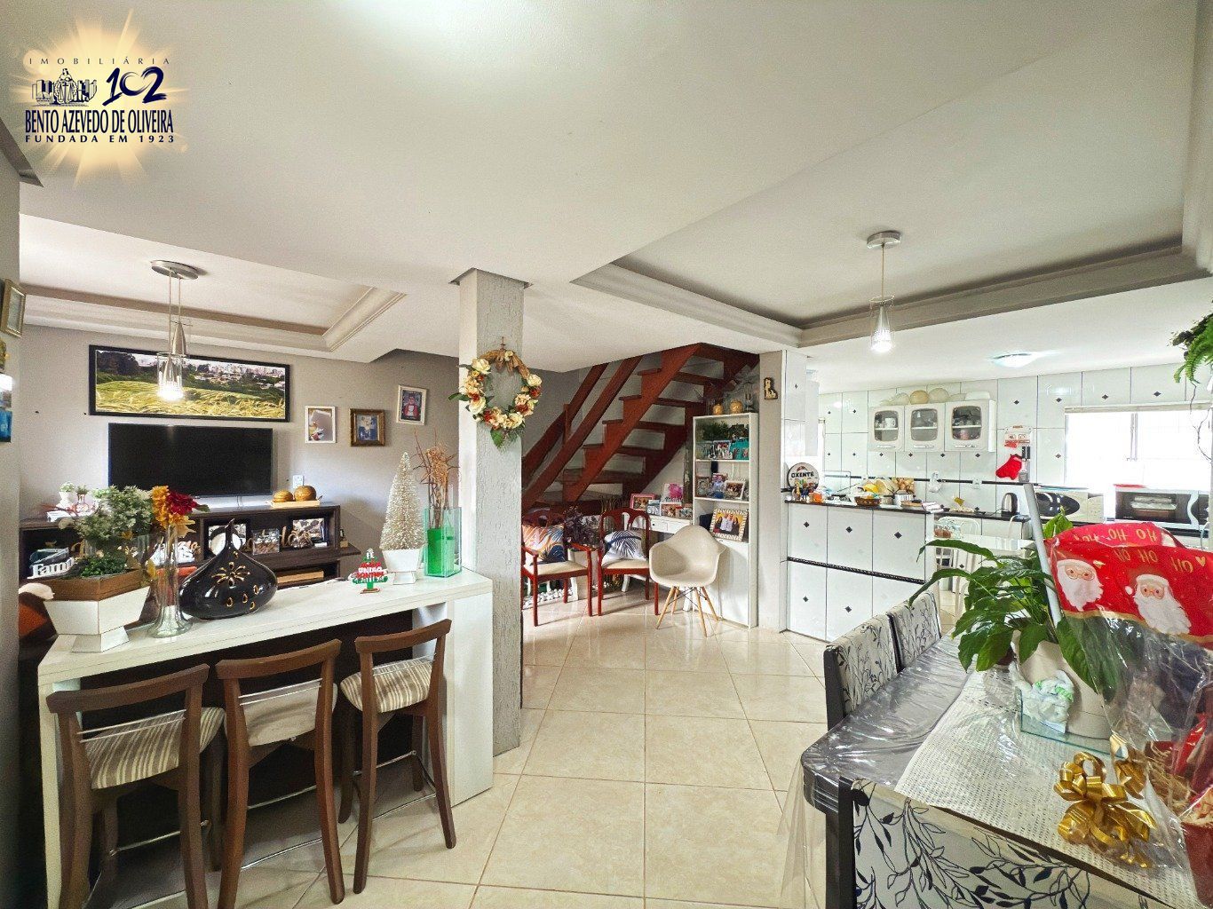 No primeiro piso, encontram-se a sala de estar e jantar, integradas, a cozinha e um banheiro social, compondo uma área social prática e bem definida. A garagem dispõe de churrasqueira e duas vagas, sendo uma coberta e outra descoberta.