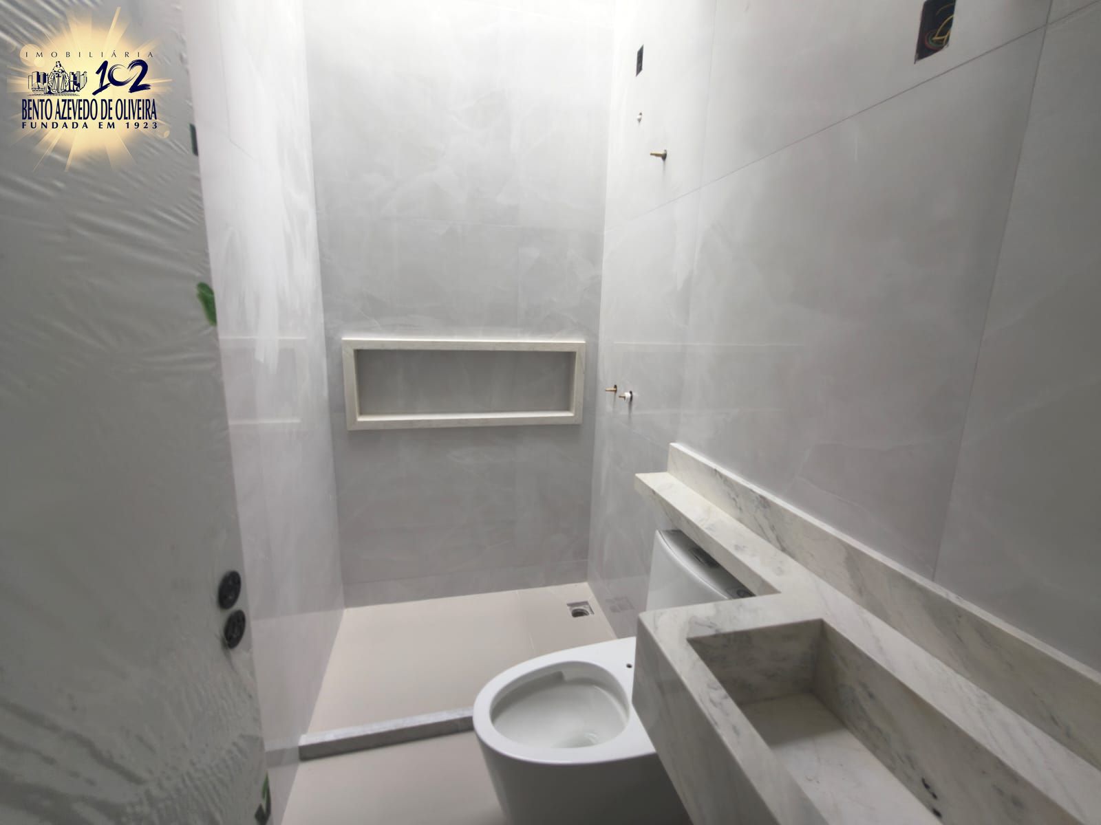 Banheiro Social: Diferenciado com pia em Ônix White, trazendo um toque de exclusividade.