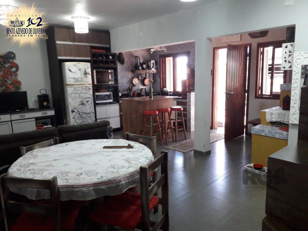 O primeiro piso possui sala e cozinha integradas, banheiro, fogão a lenha campeiro, cozinha projetada com móveis sob medida, além de armário embutido abaixo da escada. Os demais móveis não permanecem. Sistema de água quente já instalado.