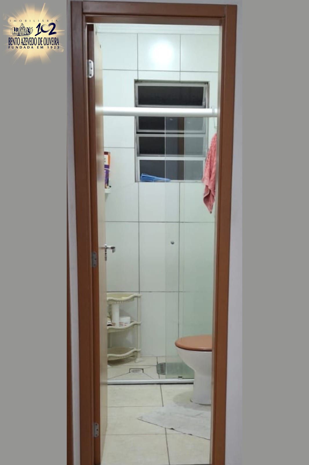 Banheiro totalmente revestido em cerâmica, box de vidro, armários planejados, ambiente arejado e iluminado com janelas que contem abertura para o exterior.