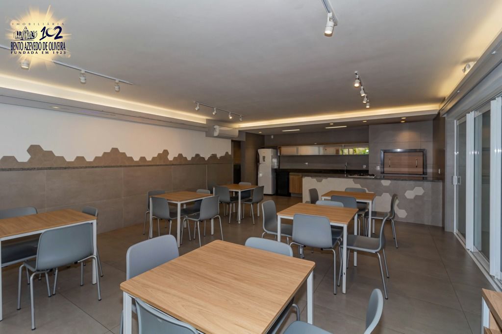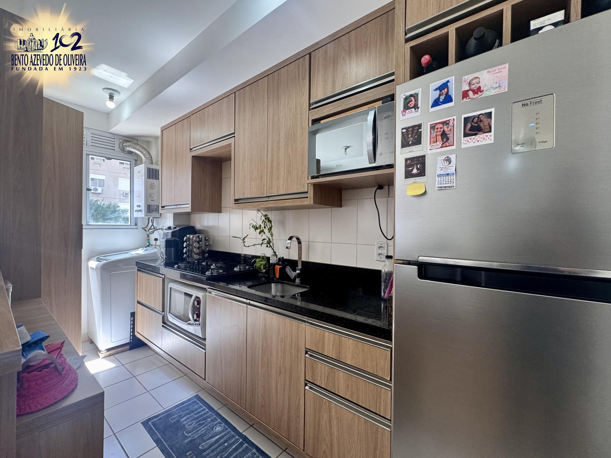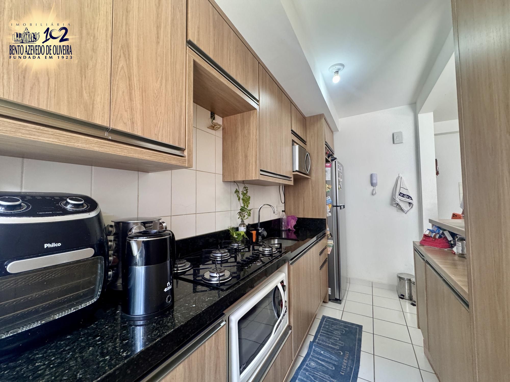Apartamento com living para dois ambientes e sacada aberta com vista livre e sol da manhã, proporcionando ambientes claros e agradáveis. A cozinha americana é mobiliada e se integra à área de serviço, trazendo praticidade para o dia a dia.