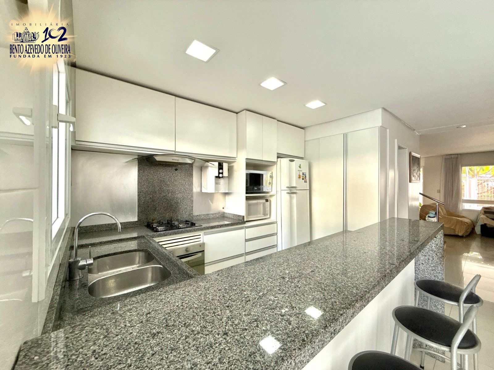 O pavimento térreo conta com living amplo para sala de estar e jantar integradas, cozinha com móveis planejados e espaço goumet com churrasqueira, além de lavabo, lavanderia e um pátio ensolarado que amplia a área social da casa.
