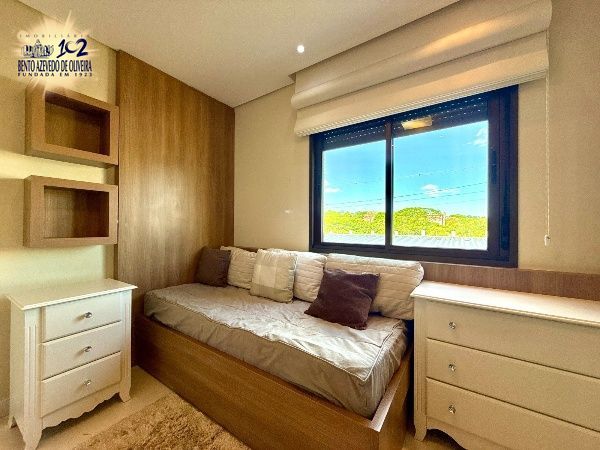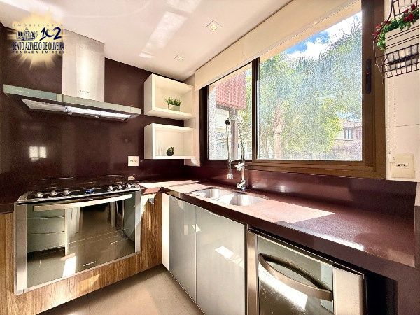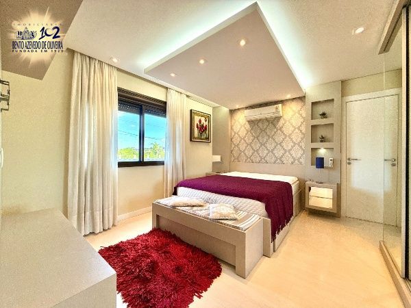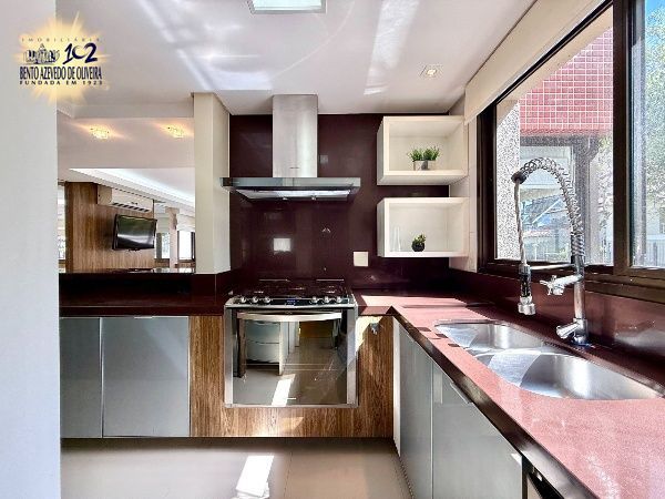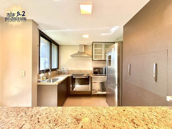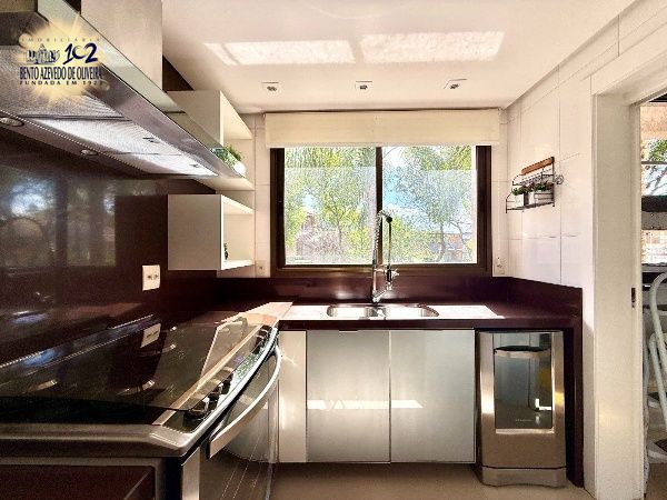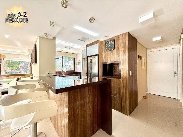 O living é amplo, com excelente iluminação natural e ambientes bem distribuídos para sala de estar e jantar, com piso em porcelanato e split. A cozinha em conceito aberto, com churrasqueira, integra-se à área social, criando um espaço funcional e ideal para receber. A área de serviço é separada, garantindo organização no dia a dia.