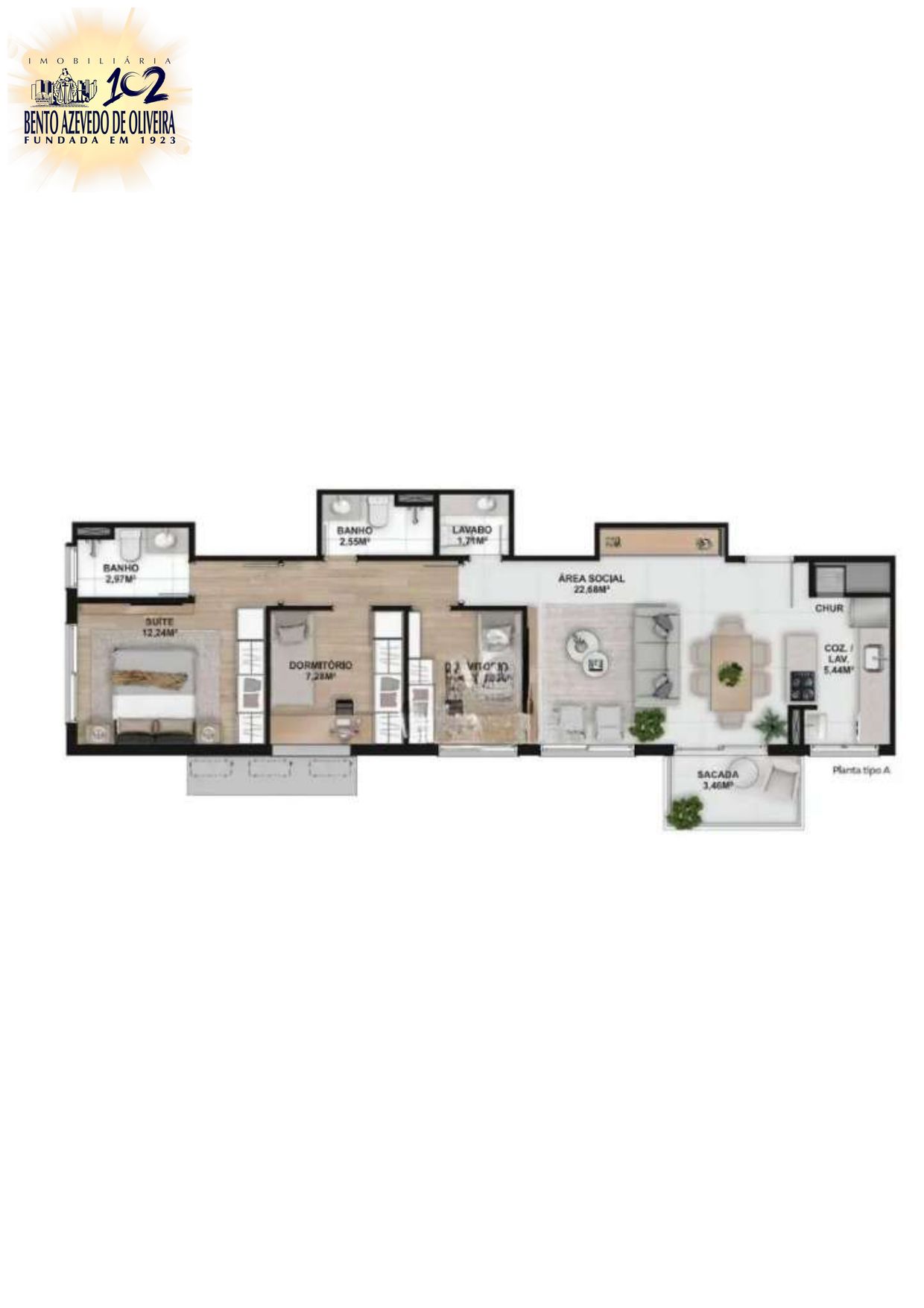 2 Dormitórios, lavabo, banho social, sala de estar com sacada e cozinha com churrasqueira. Garagem com espera para carro elétrico.