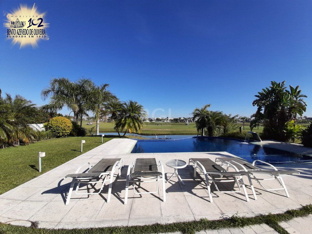 A sacada do andar superior, com suas linhas sinuosas, interliga os dormitórios, e desvenda uma vista deslumbrante para os lagos e campo de golfe, além do belo jardim com piscina aquecida.