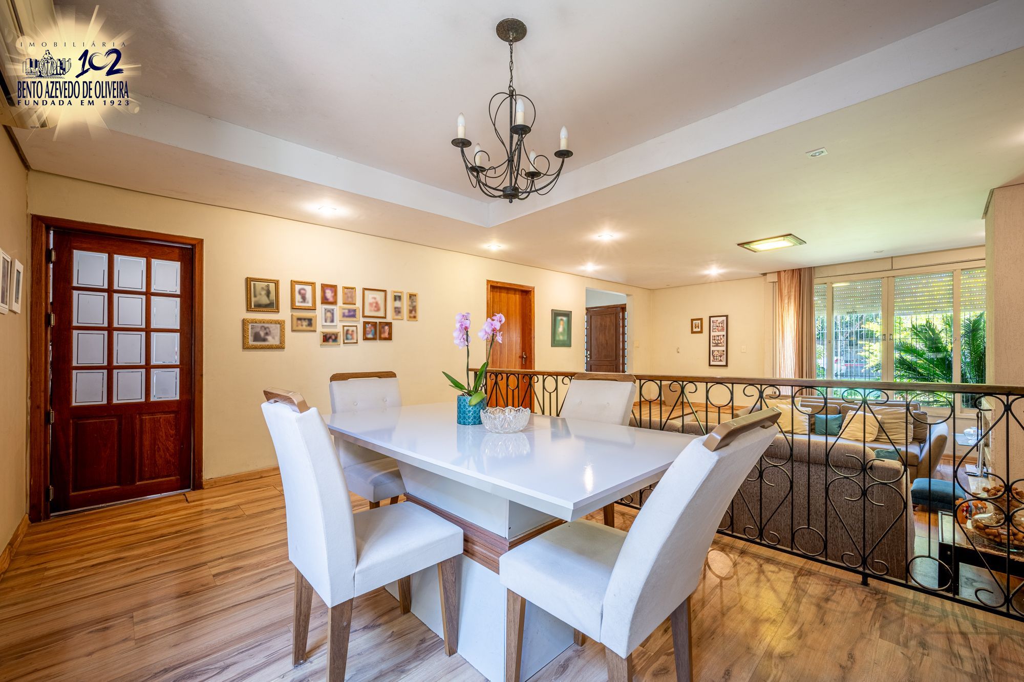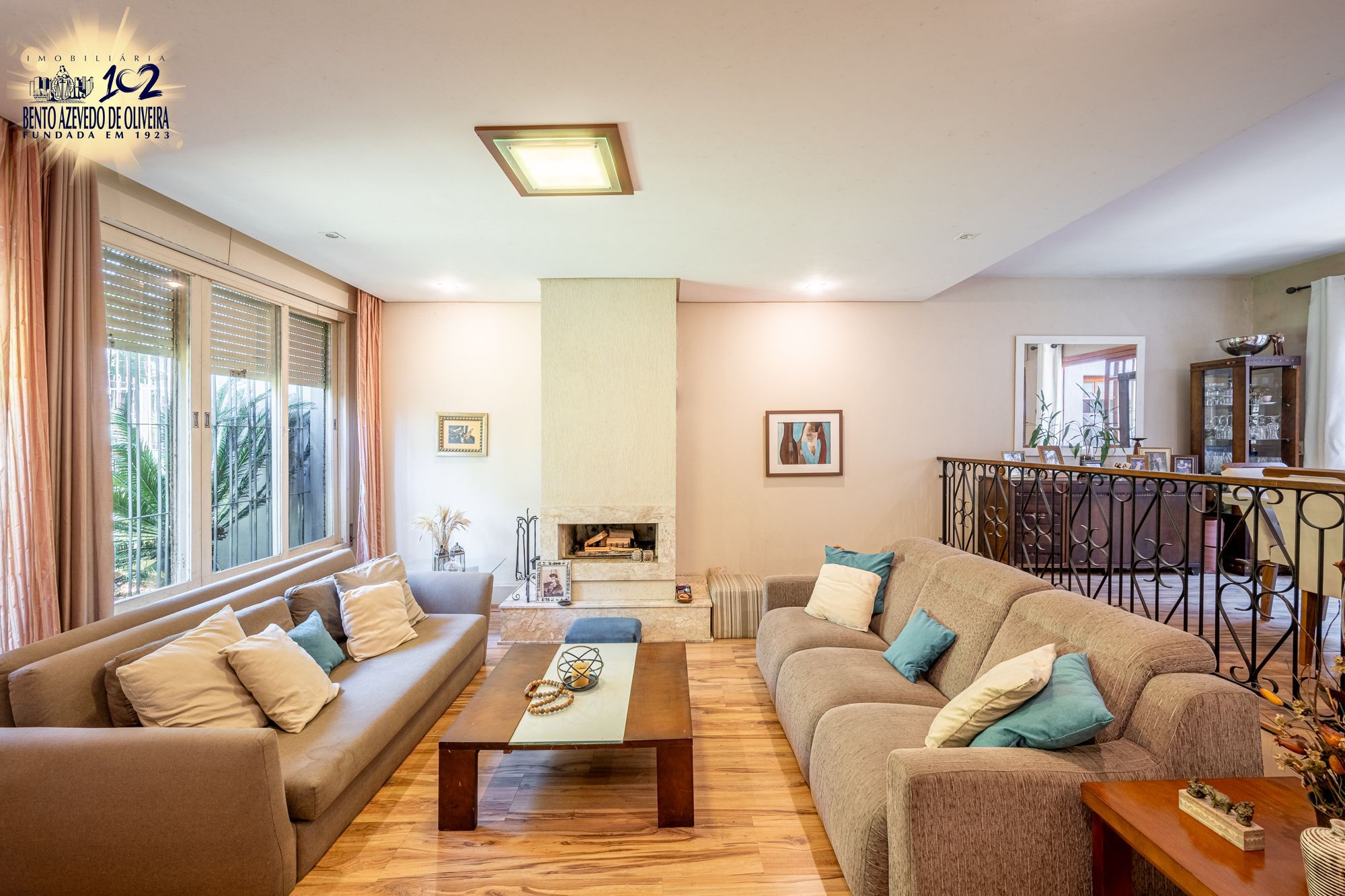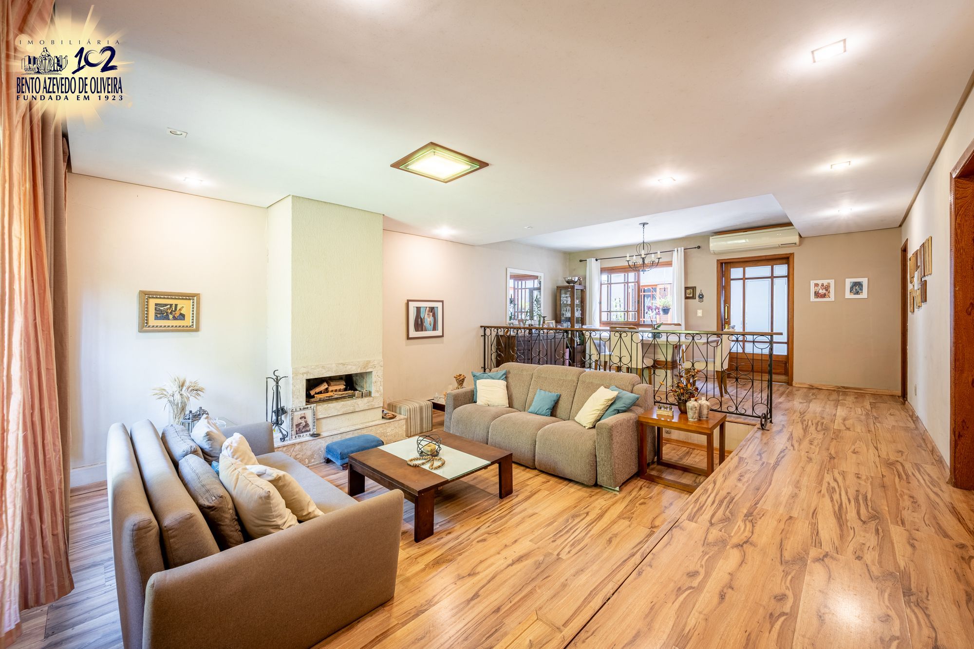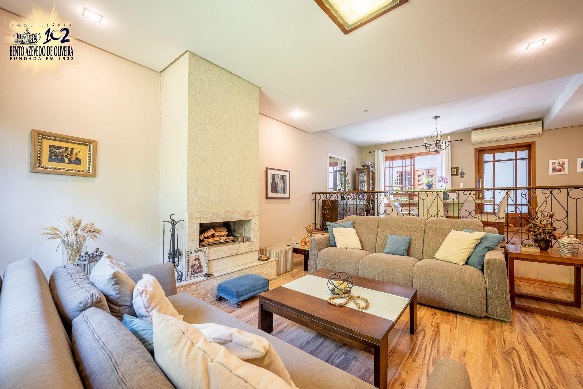 No pavimento principal, a casa conta com 3 dormitórios, sendo 1 suíte, banheiro social, e um escritório espaçoso. O living com lareira integra dois ambientes e ainda possui lavabo e um estar íntimo, ideal para sala de TV ou convivência familiar.