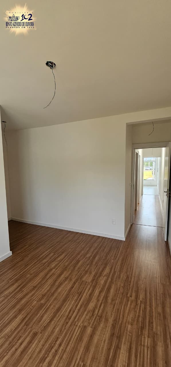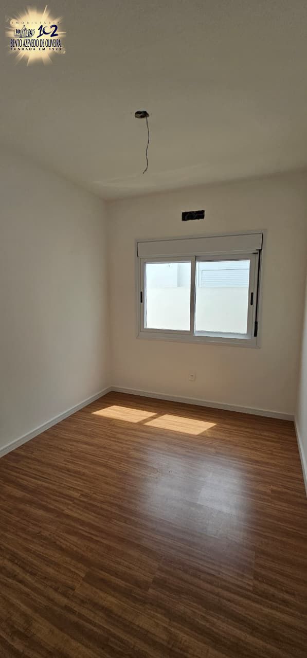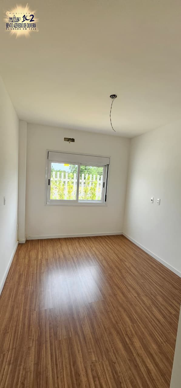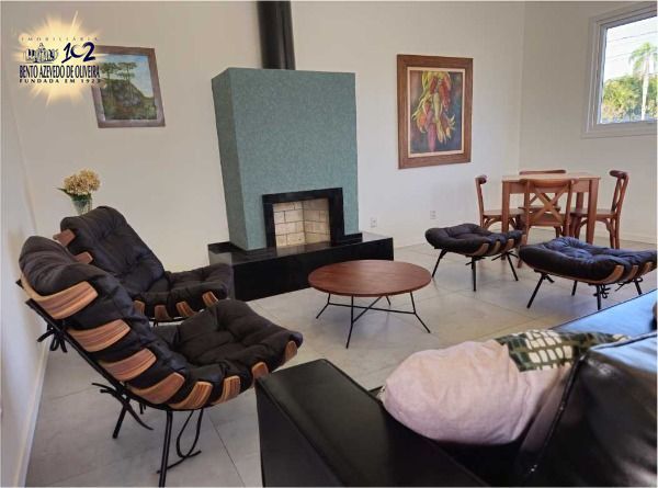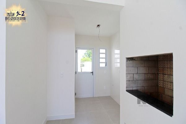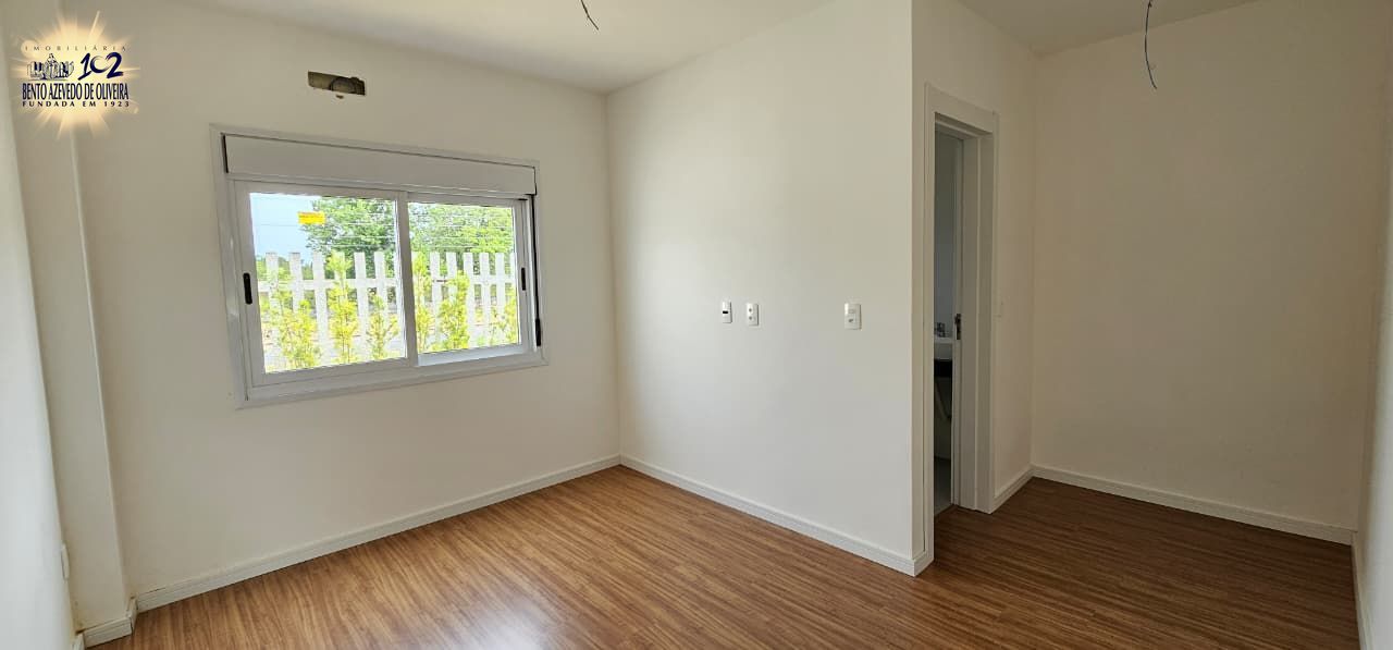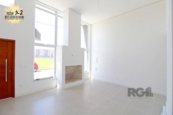 living amplo com pé direito duplo, lareira, com uma suíte, banheiro social, área de serviço, churrasqueira, duas vagas, porcelanato nos banheiros e living, laminado nos dormitórios, com pátio.