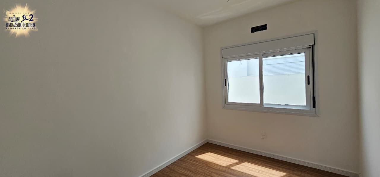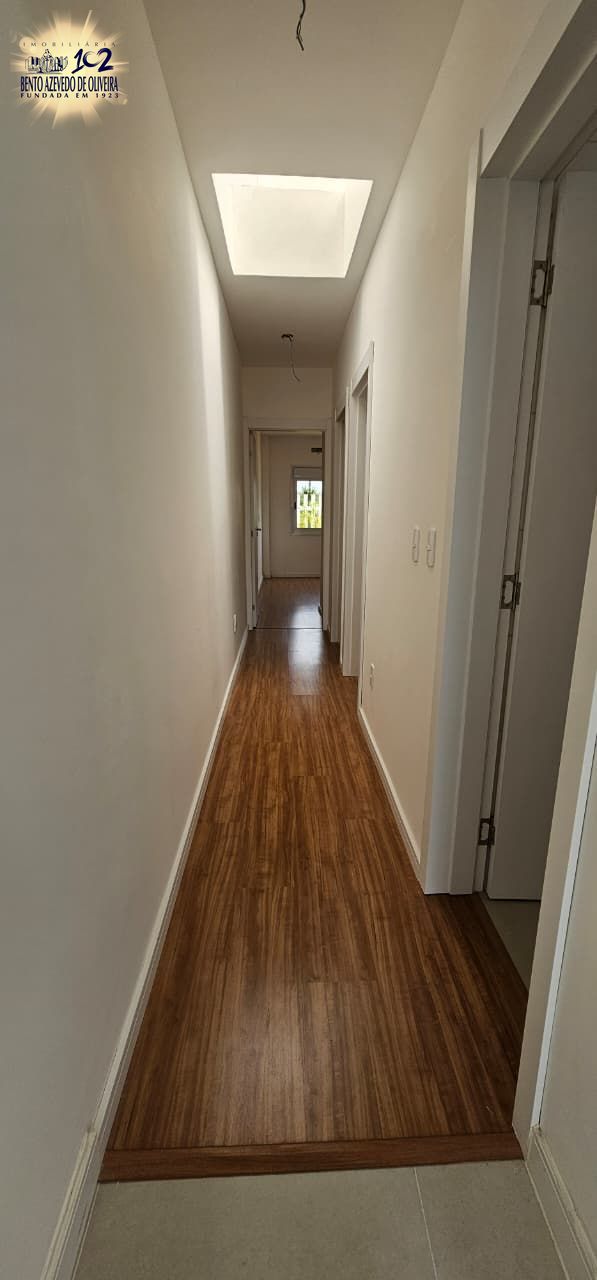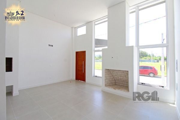 living amplo com pé direito duplo, lareira, com uma suíte, banheiro social, área de serviço, churrasqueira, duas vagas, porcelanato nos banheiros e living, laminado nos dormitórios, com pátio.