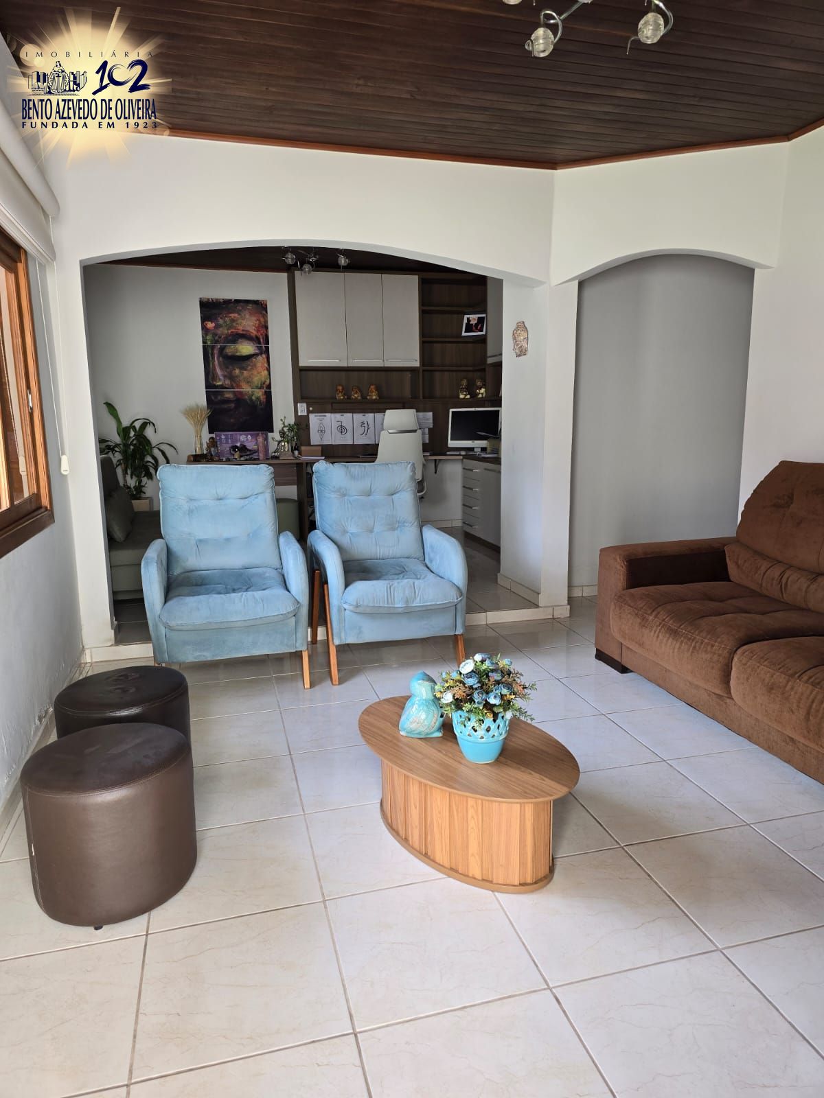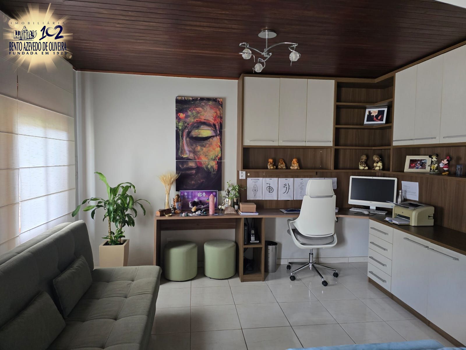 Área Social: Living em dois ambientes com elegante desnível, composto por sala de TV com painel ripado e um espaçoso home office/biblioteca totalmente equipado com bancada em "L" e armários aéreos. Conta com ar-condicionado Split de 18.000 BTUs e cortinas completas.