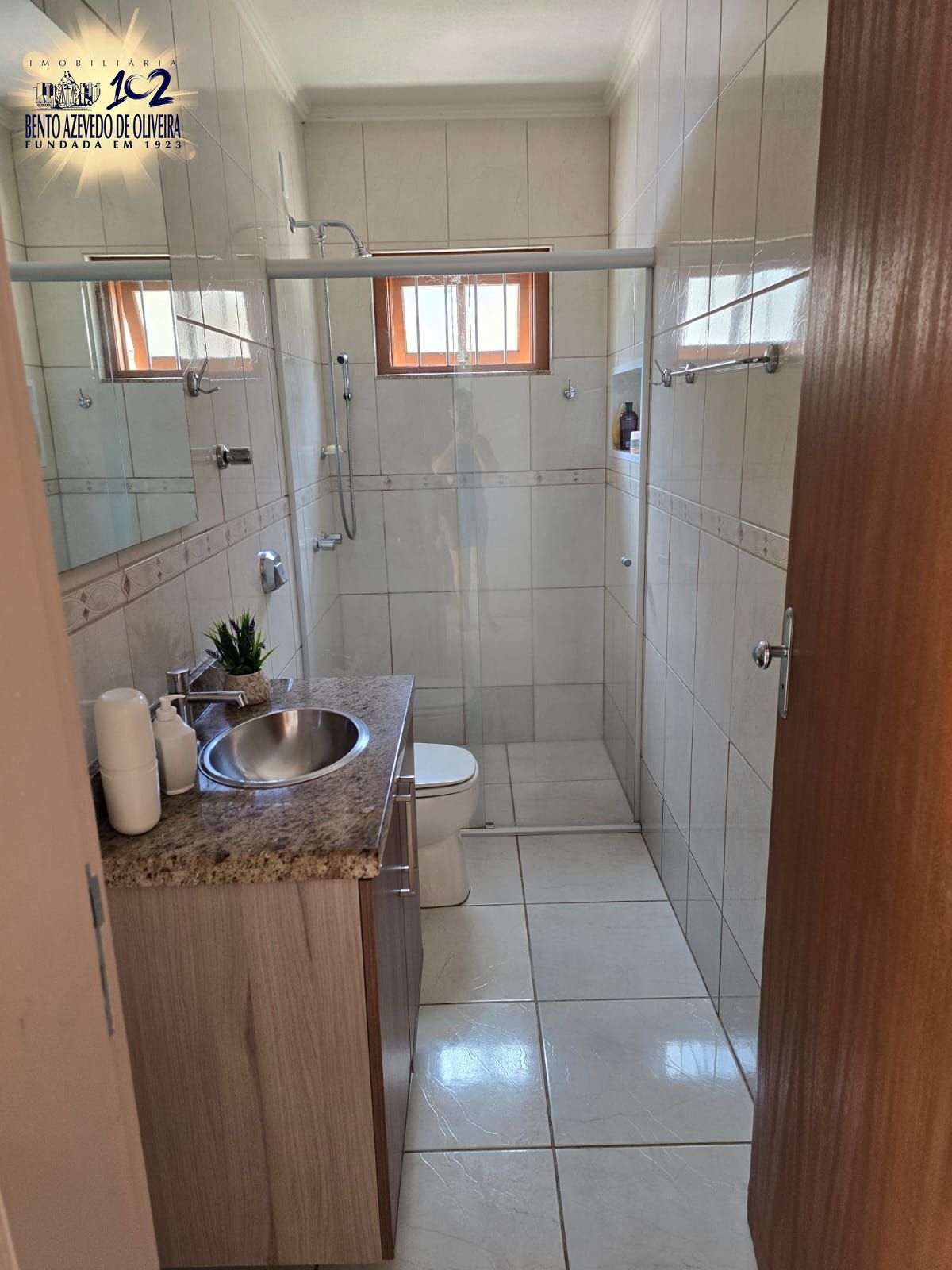 Banheiro Social: Acabamento em granito, box Blindex, ventilação natural e sistema de chuveiro a gás (Junker).