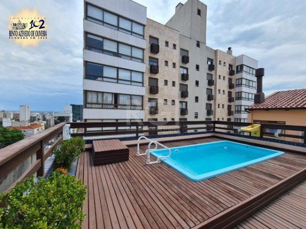 Cobertura para Venda - 263.45m², 3 dormitórios, sendo 1 suite, 2 vagas - Mont Serrat. Apartamento cobertura, armários sob medida, com 03 dormitórios ou 02 com gabinete, suíte master com closet, sacada, banheiro social, lavabo, cozinha, área de serviço, sala de estar ampla com pé direito alto, lareira, sala de jantar. Estar com churrasqueira, mais um banheiro completo na cobertura, terraço, piscina com fonte, garagem individual para dois carros. Ar condicionado split. Piso em madeira Ipê. Duas vagas de estacionamento individuais. Cobertura diferenciada com ares de casa, acolhedora e ampla, muito sol. Agende já sua visita e encante-se.