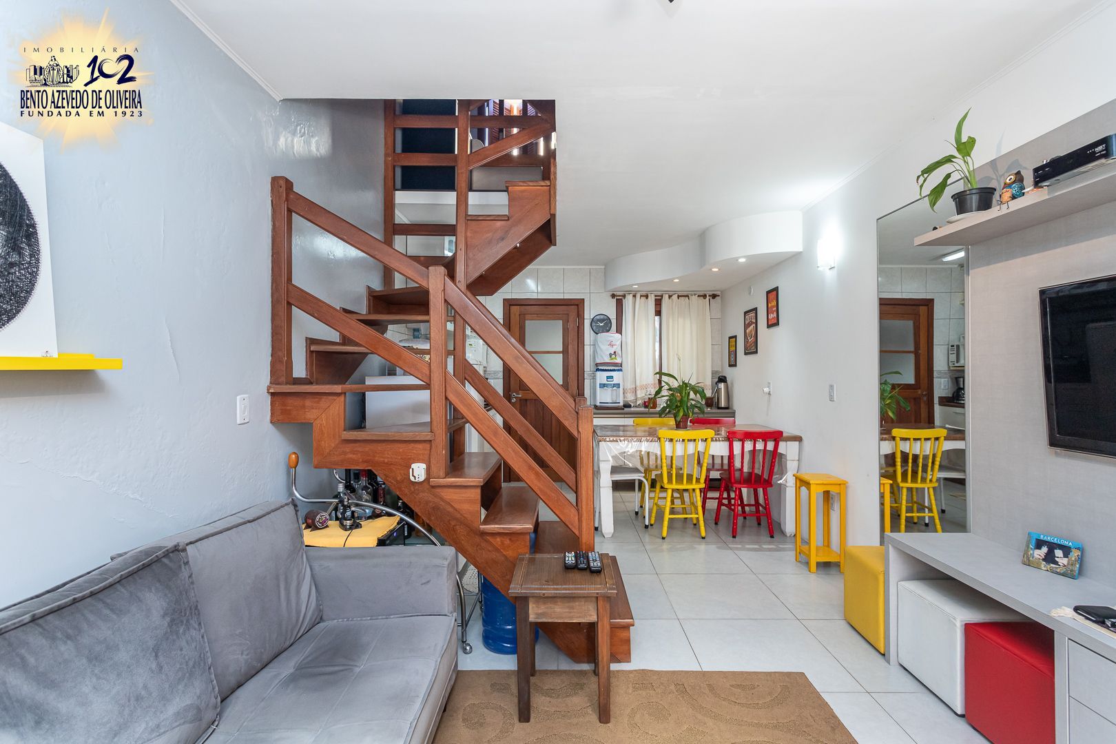 Living aconchegante, cozinha americana, área de serviço e pequeno pátio com churrasqueira.