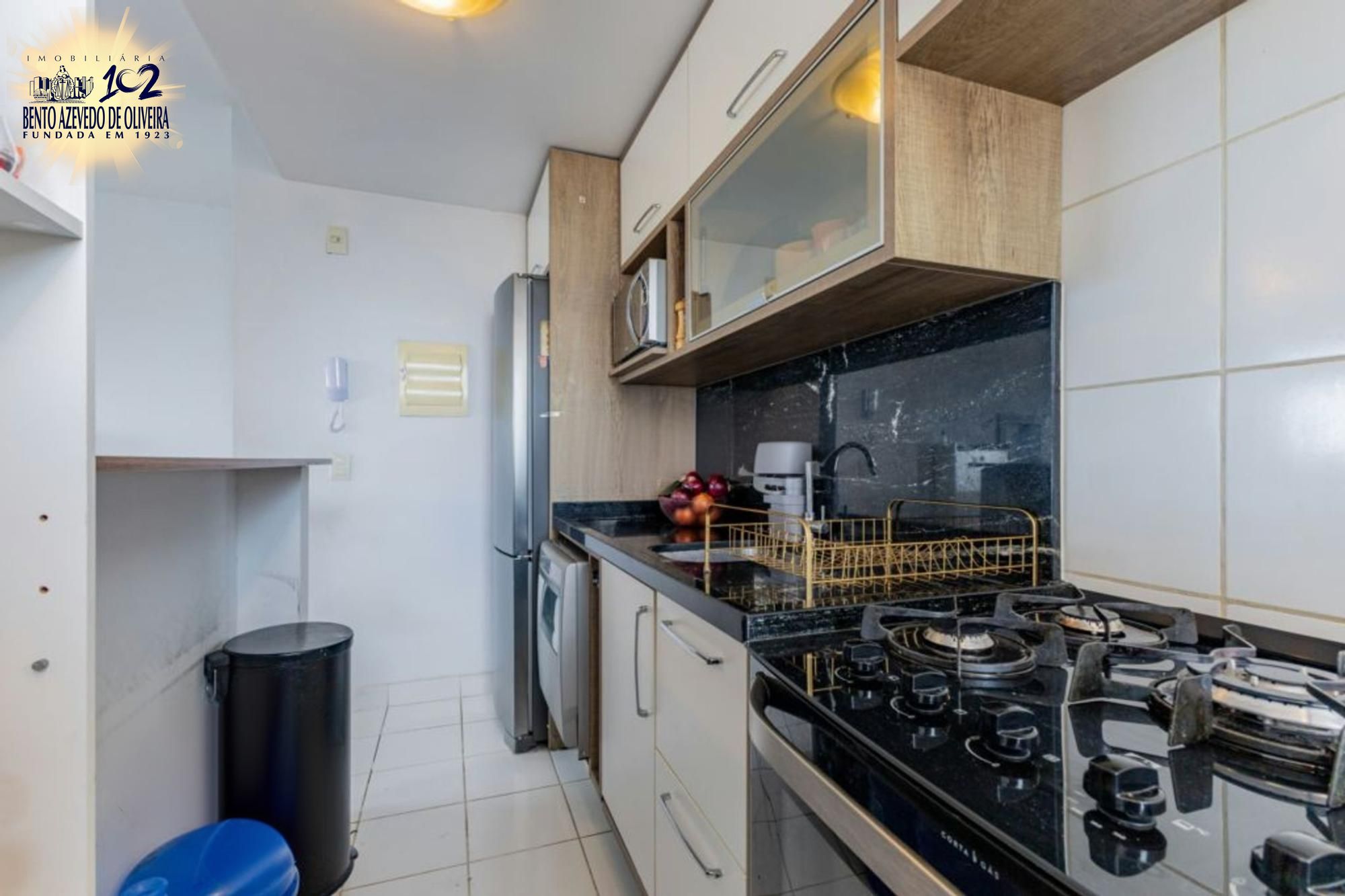 Cozinha ampla com móveis planejados, iluminada e ventilada, com área de serviço integrada e janelas com abertura para o exterior.