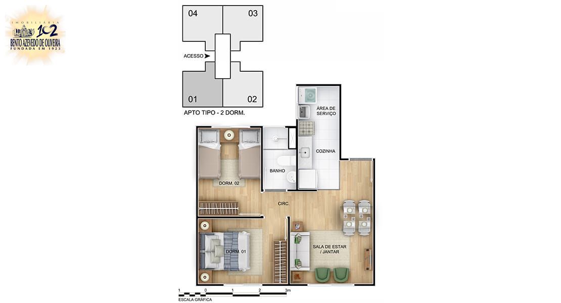 Apartamento com 2 dormitórios, banheiro, sala ampla com cozinha conjugada. Bem ensolarado! Condomínio com quiosques com churrasqueiras, salão de festas, brinquedos ao ar livre, vaga de garagem, portaria 24 horas.