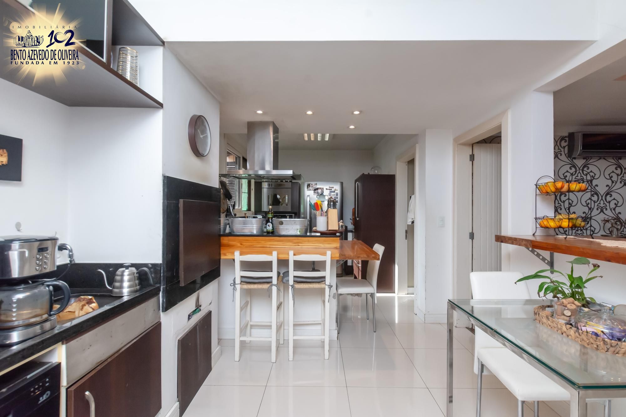 A cozinha americana planejada é moderna e funcional e equipada com churrasqueira. O piso em tabuão confere elegância e durabilidade ao espaço, complementando o acabamento de alto padrão do apartamento.