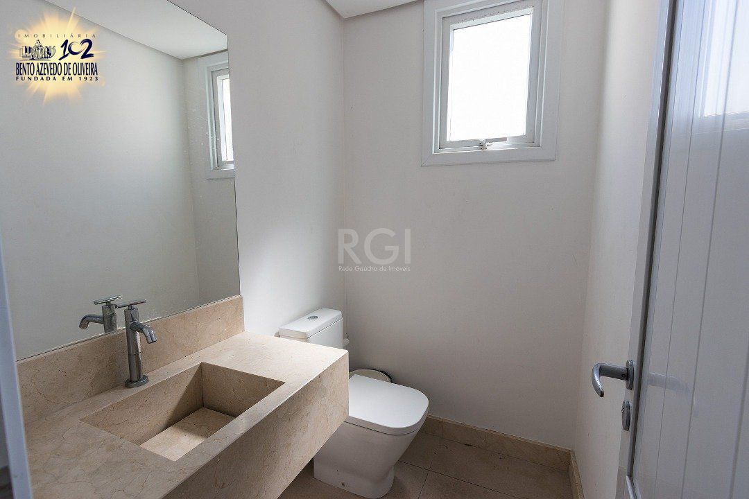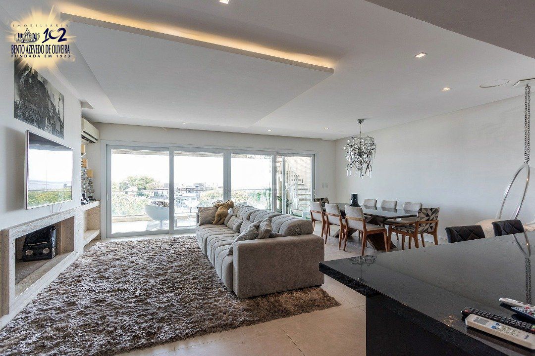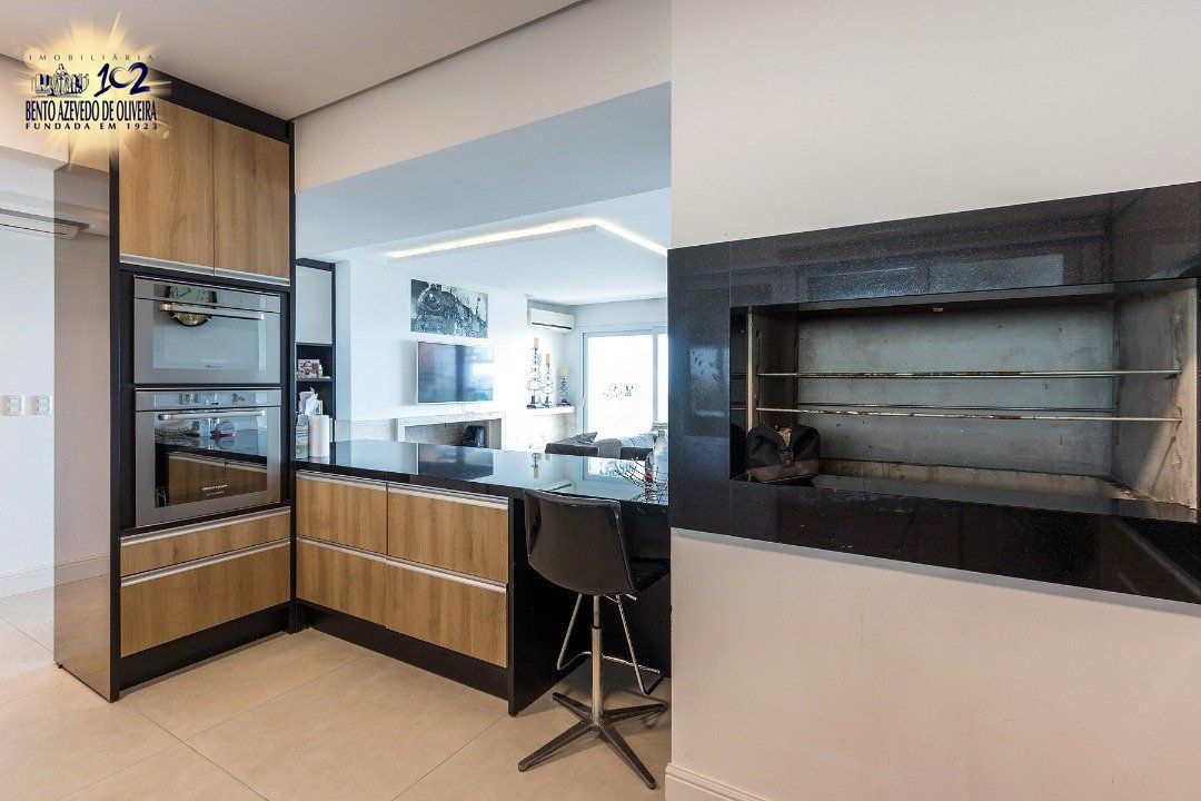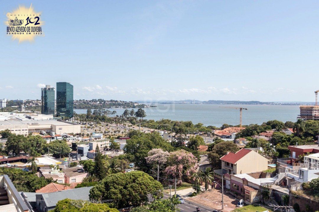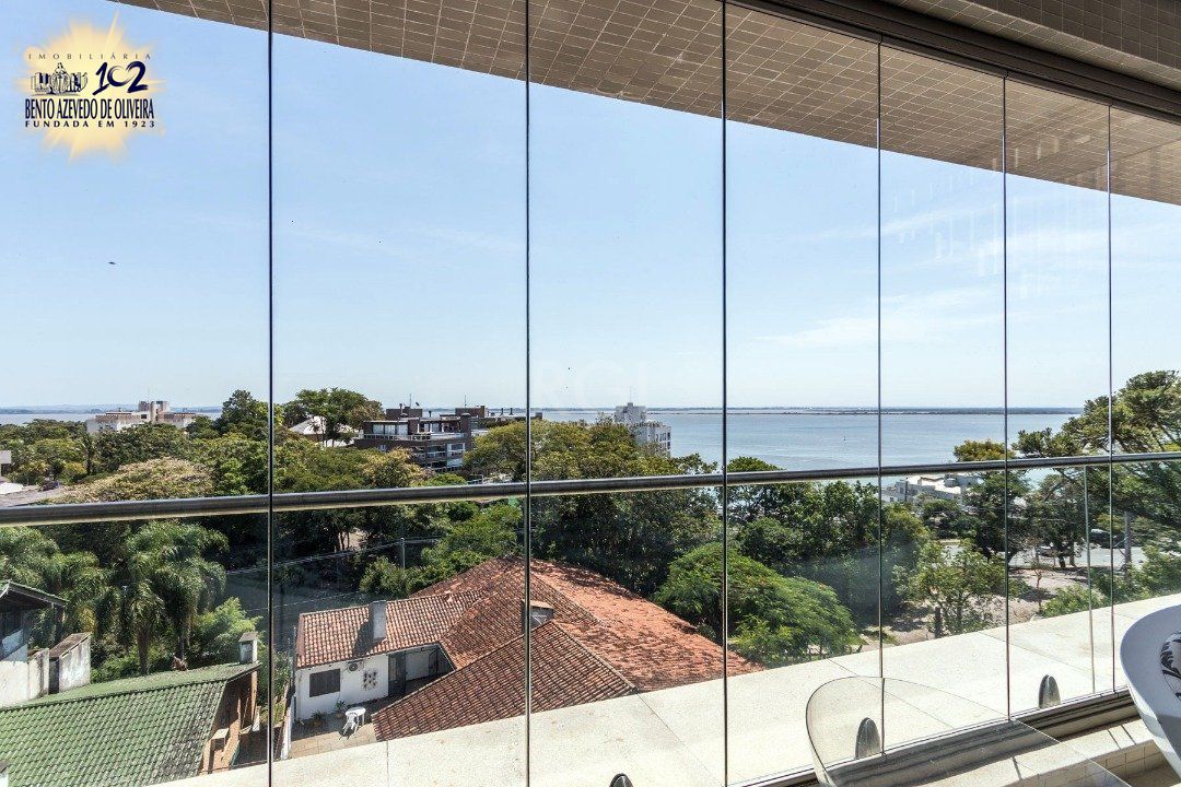 Cozinha americana com churrasqueira, área de serviço com banheiro auxiliar. Lavabo, lareira, sacada integrada com vista do Guaíba sentido sul/oeste.