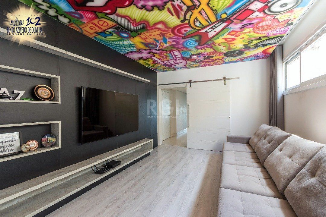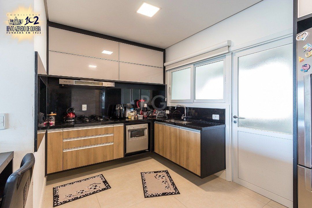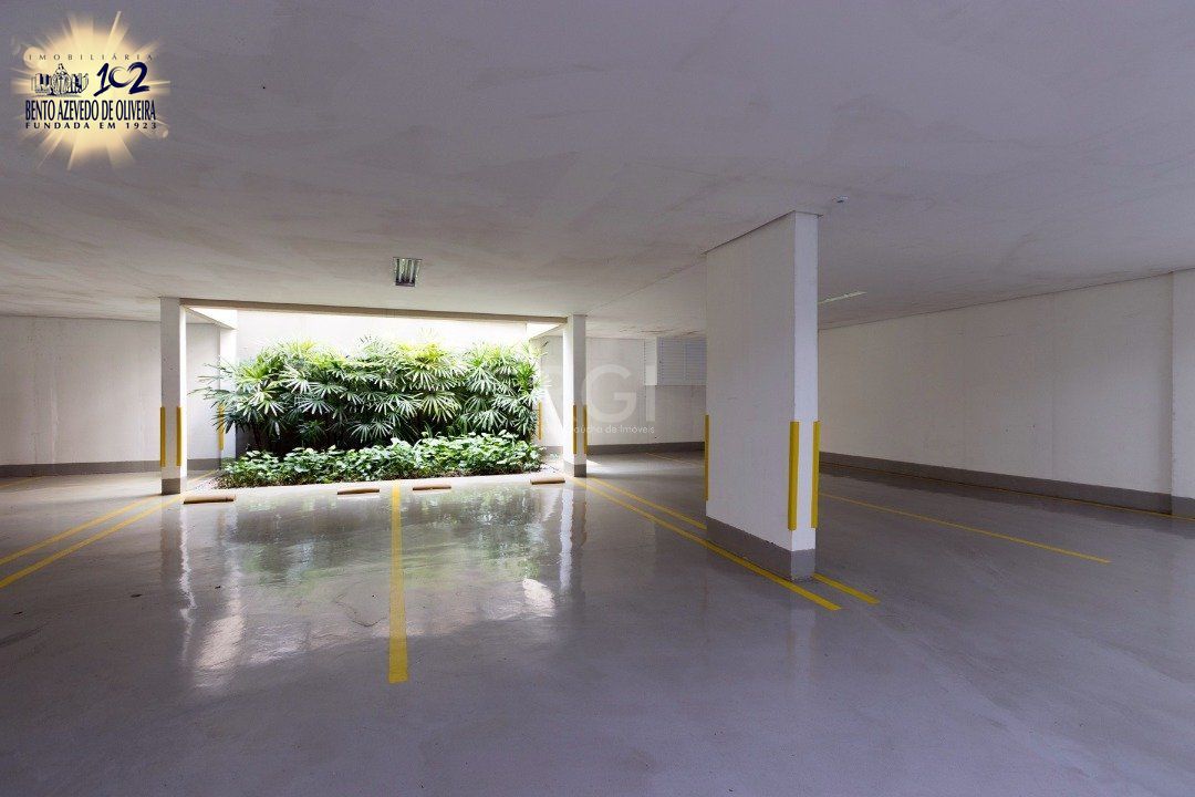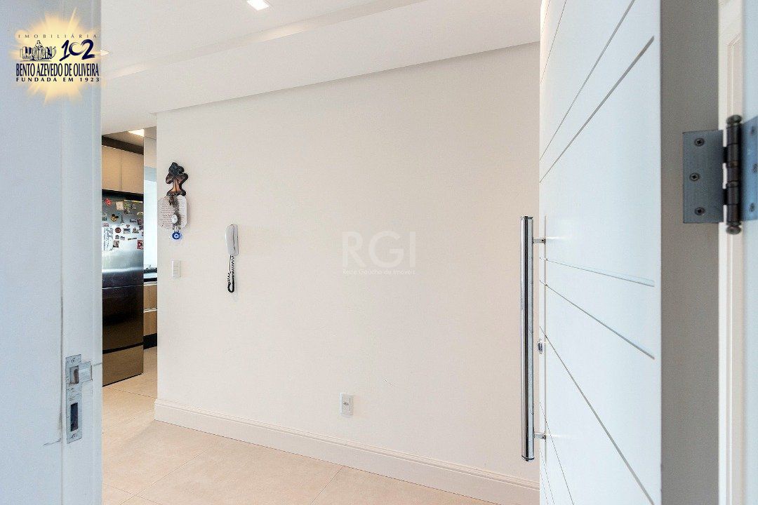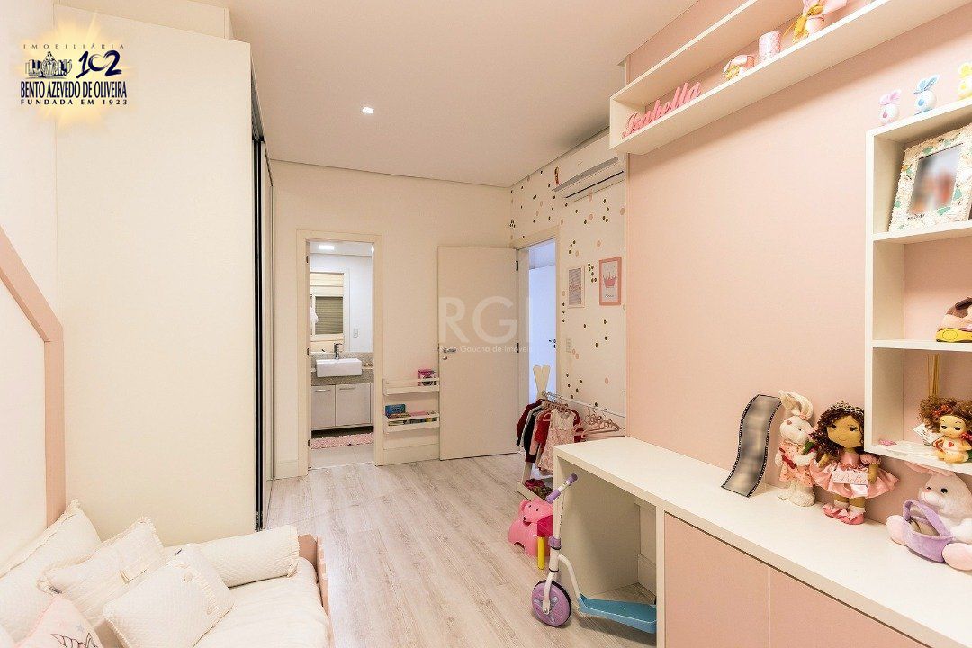 Cozinha americana com churrasqueira, área de serviço com banheiro auxiliar. Lavabo, lareira, sacada integrada com vista do Guaíba sentido sul/oeste.