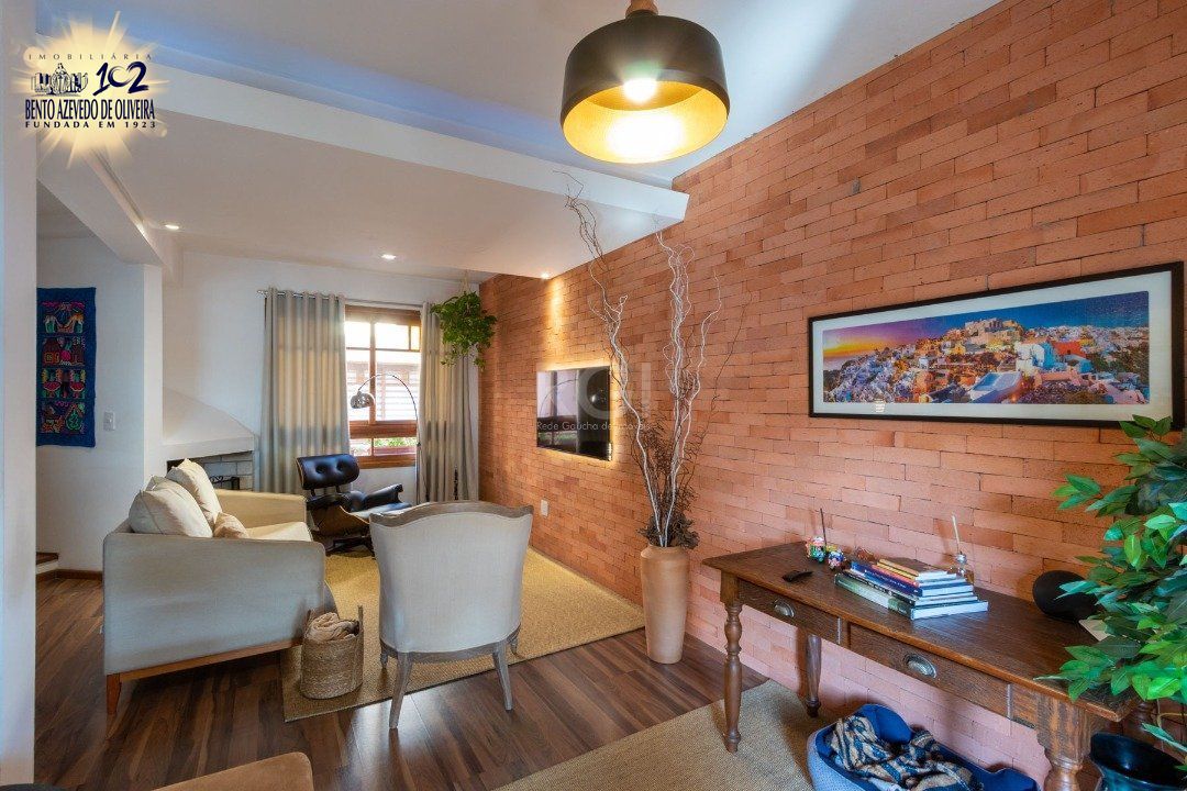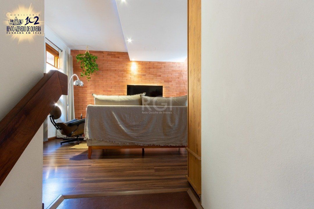 No andar superior, três dormitórios, sendo uma suíte, sala de jantar, lareira, copa-cozinha, com vista.