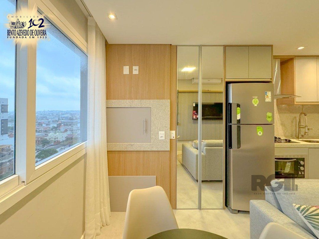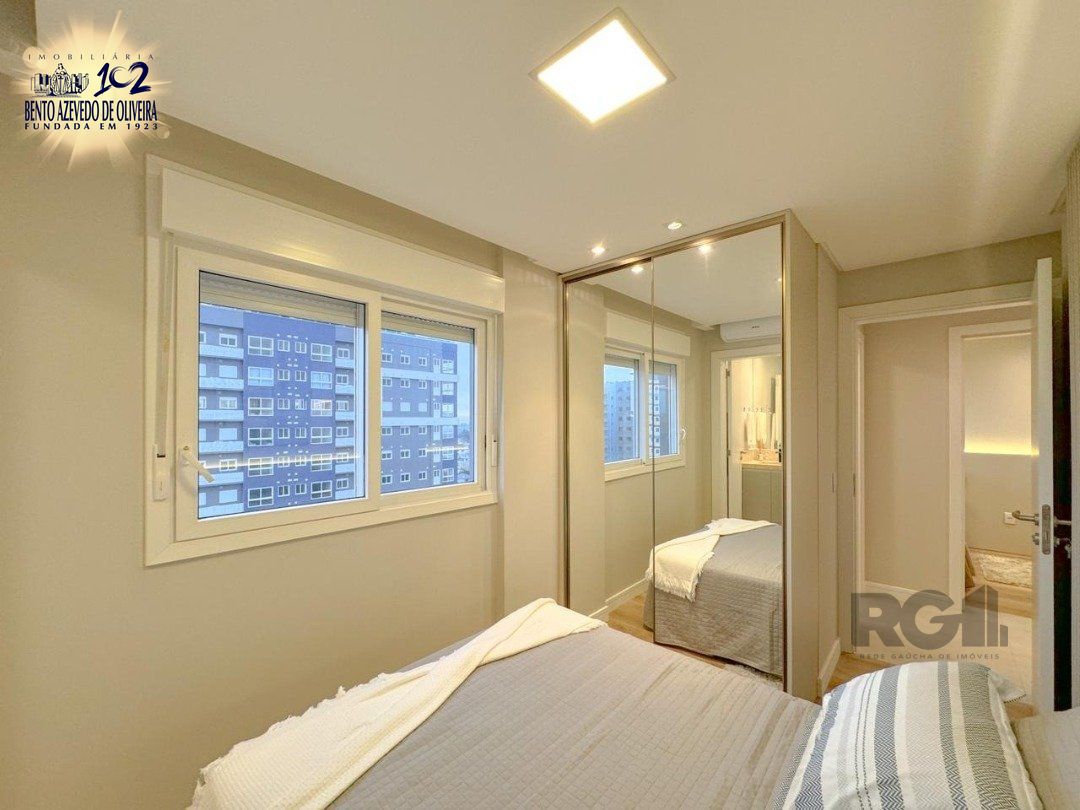 O apartamento fica no 12° andar, living com dois ambientes, banheiro social, e dois dormitórios, sendo um suíte.