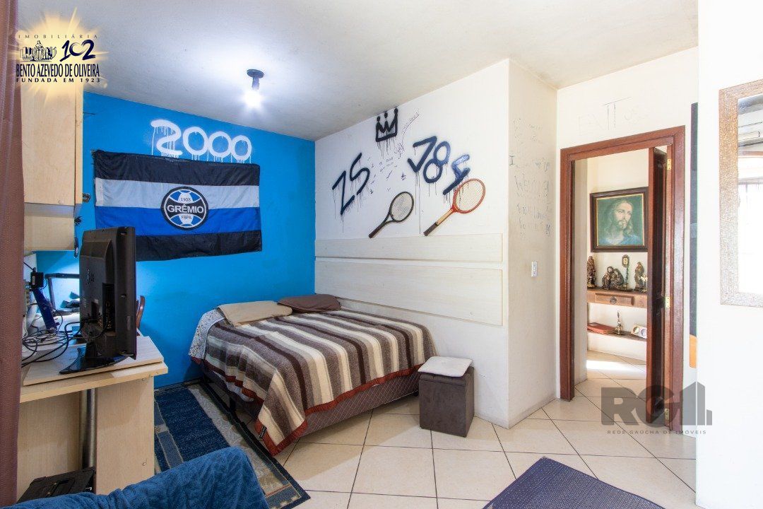 No andar superior, tres dormitorios, sendo um suite, e banheiro.
