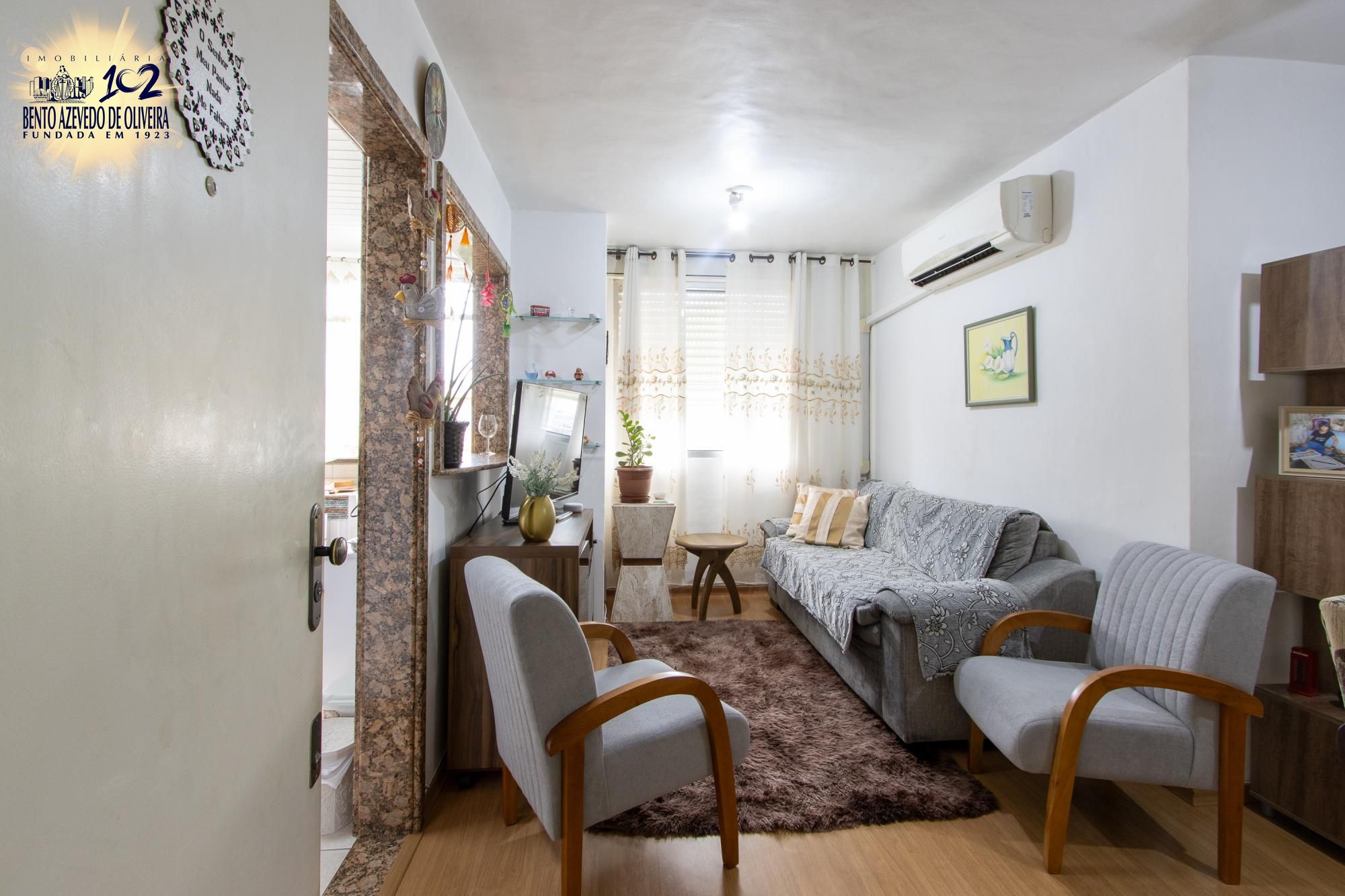 Ótimo apartamento, com boa iluminação natural! Possui um dormitório com banheiro, sala e cozinha separadas. Na sala tem piso laminado e o quarto tem carpete e uma cama de casal.