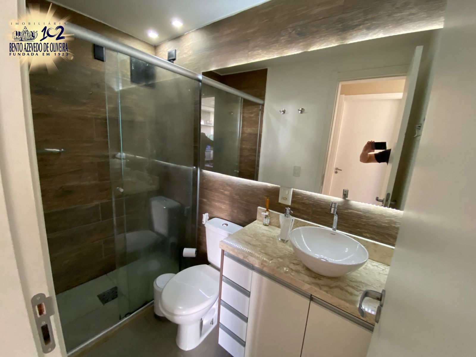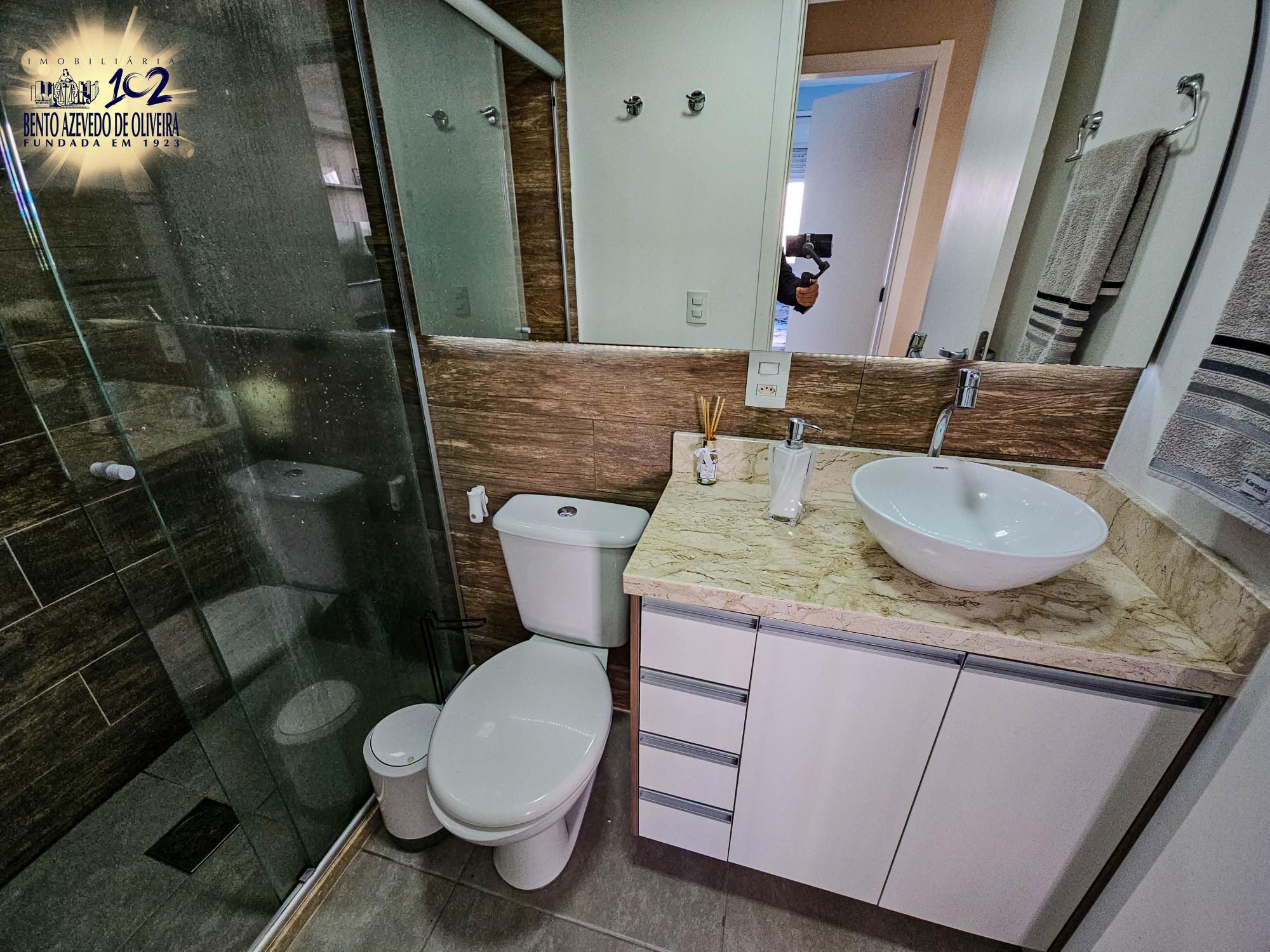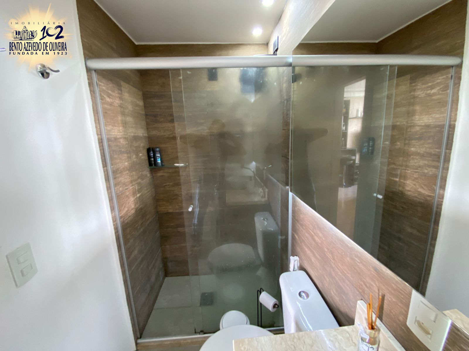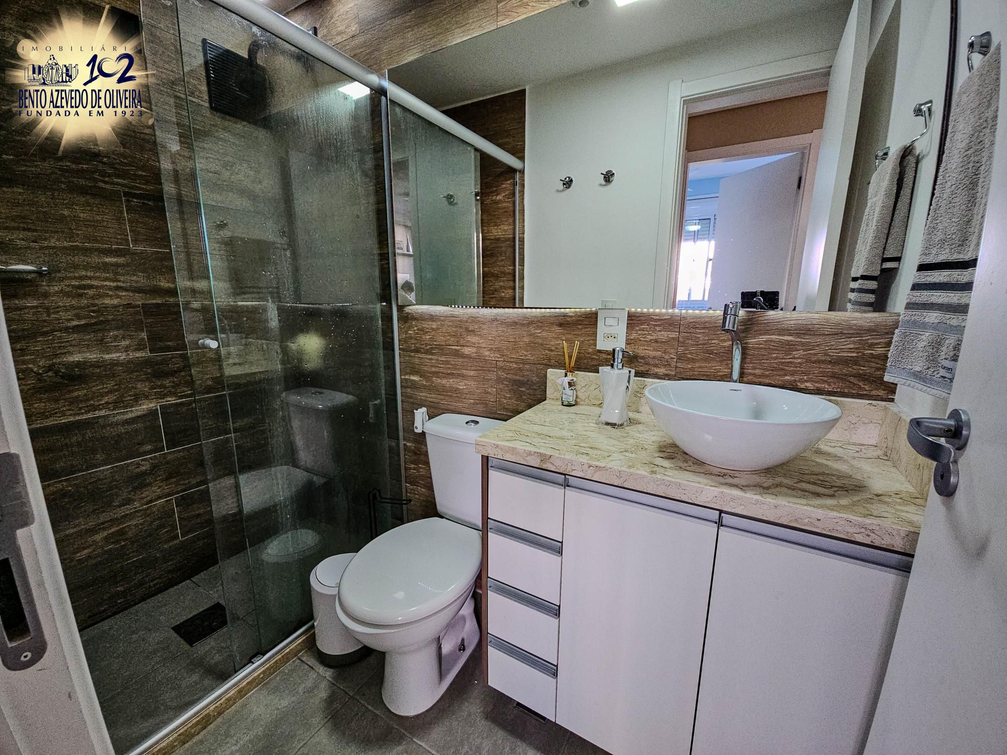 Banheiro social com box de vidro;