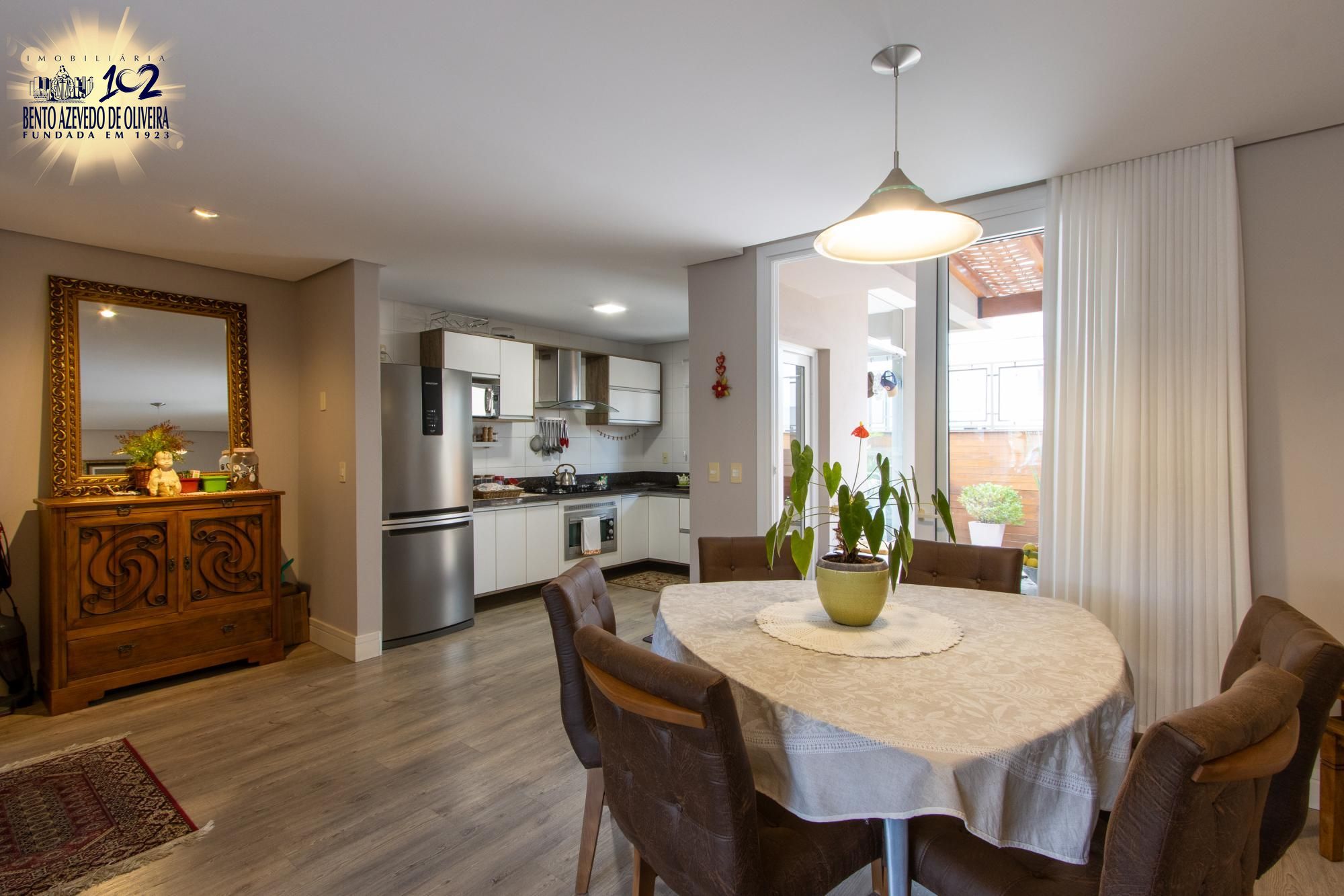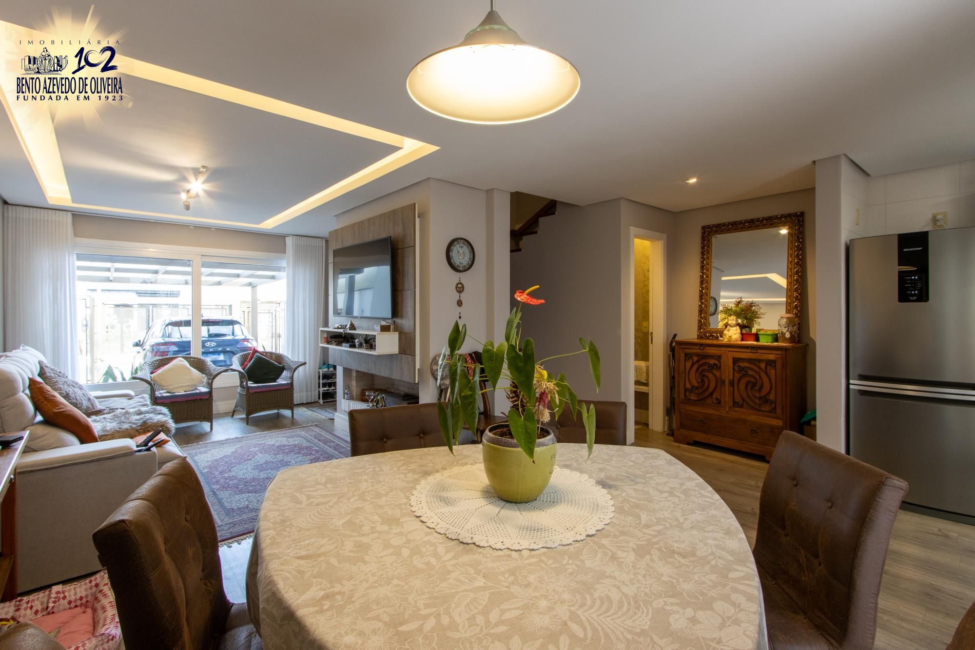 O ambiente social conta com sala de estar e jantar integradas à cozinha em um conceito aberto, proporcionando amplitude, iluminação natural e uma atmosfera acolhedora. A lareira é o destaque para os dias mais frios, tornando o espaço ainda mais convidativo.