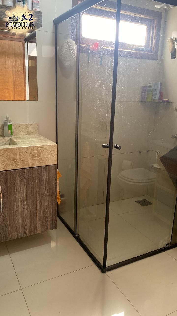 O imóvel conta com 4 banheiros: um na suíte, um banheiro social no andar superior que atende aos outros dois quartos, um lavabo no térreo e um banheiro externo na área da piscina (sem chuveiro), ideal para dar suporte aos momentos de lazer.
