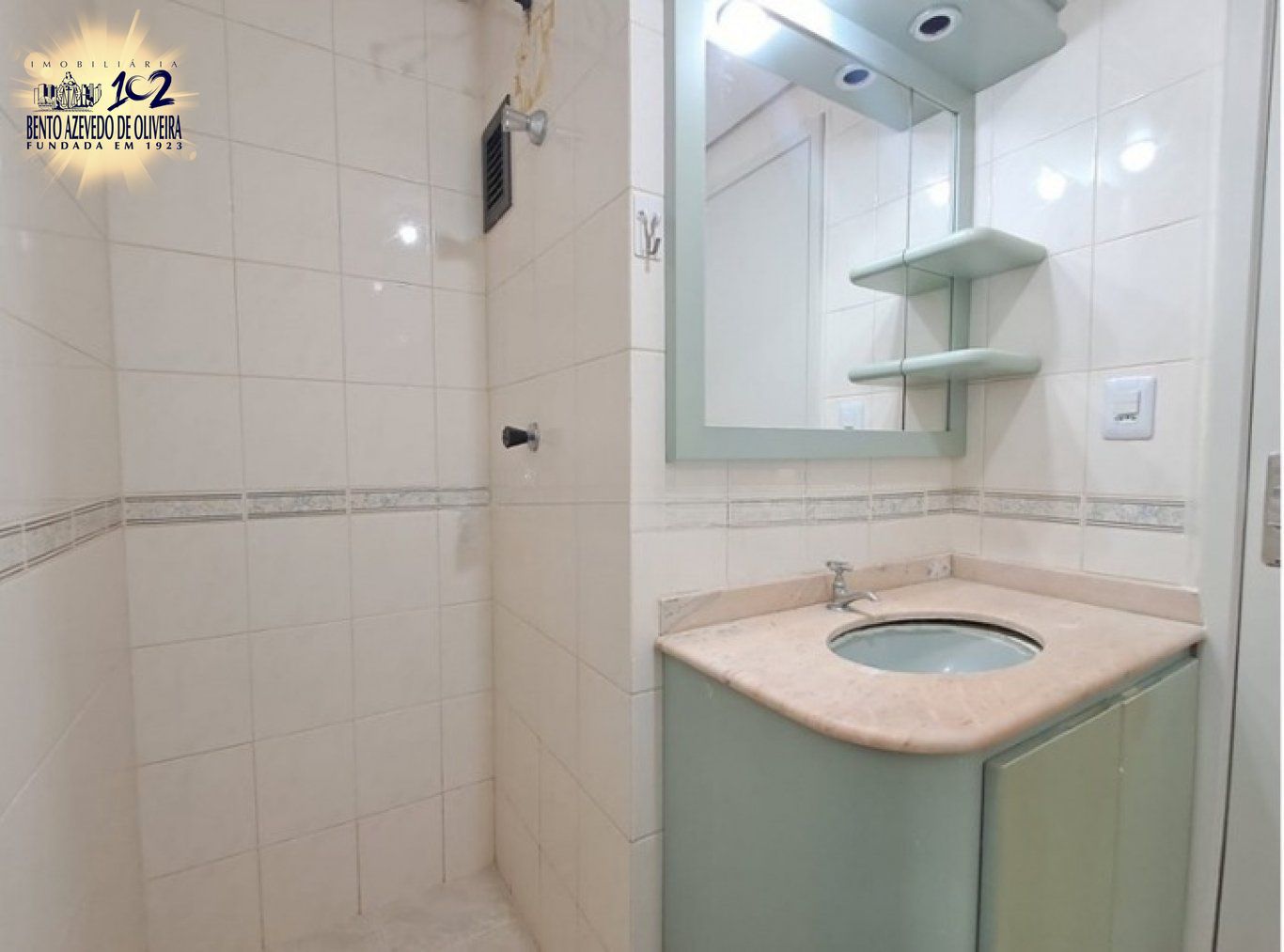 Banheiro é totalmente revestido em cerâmica, conta com box de vidro, armários planejados e ambiente arejado e iluminado.