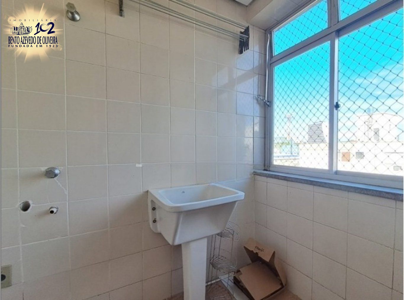 Lavanderia com tanque iluminada e ventilada.