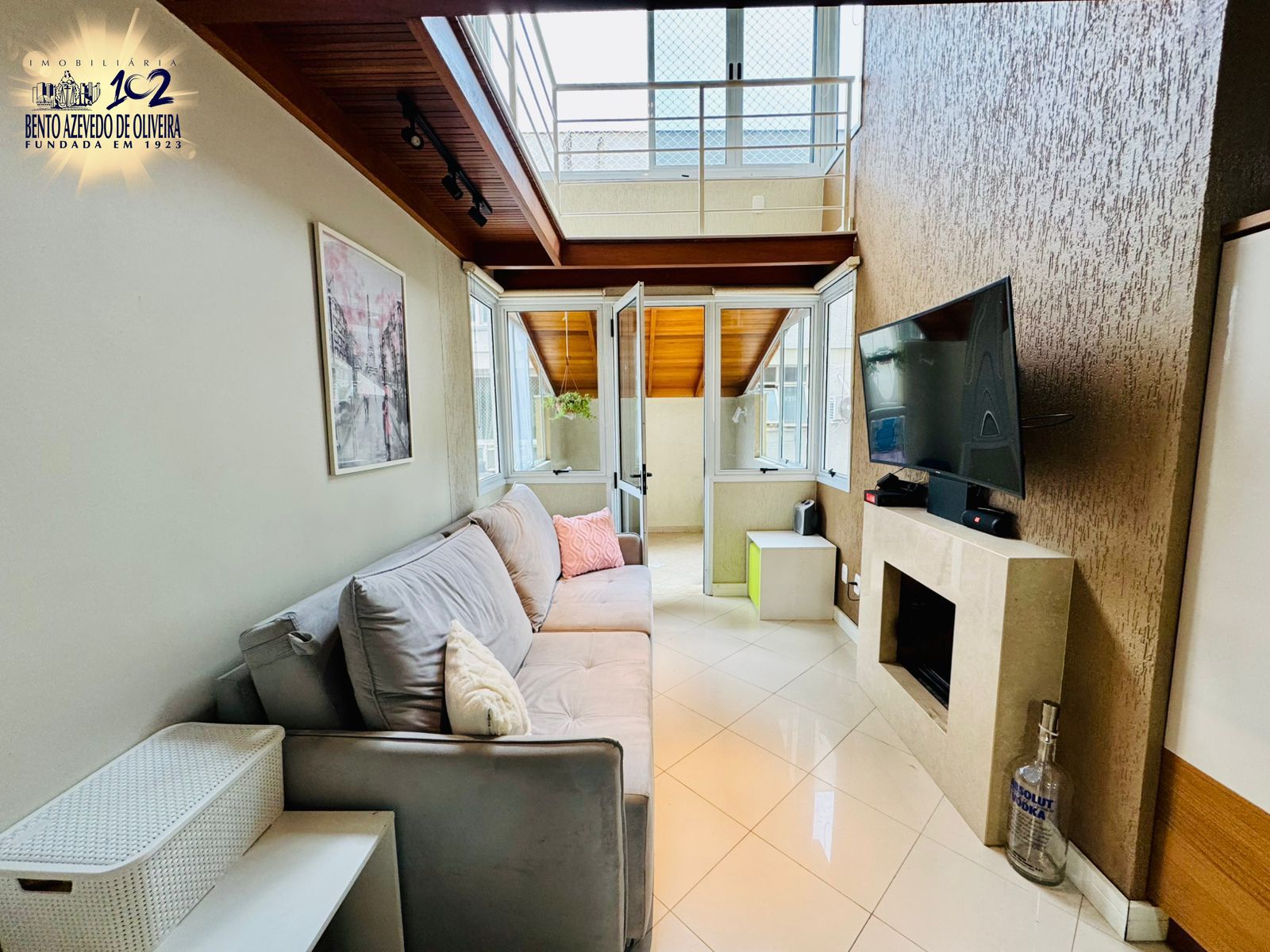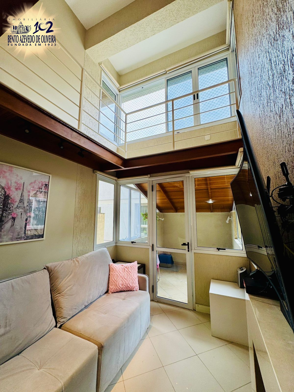 Parte de baixo com living 2 ambientes com pé direito duplo trazendo amplitude e claridade natural com sol da manhã,, Lareira, terraço fechado com vidros blindex que pode ser integrado ao living ou fazer um espaço com a sua churrasqueira, a cozinha americana ficará com móveis fixos, área de serviço integrada.