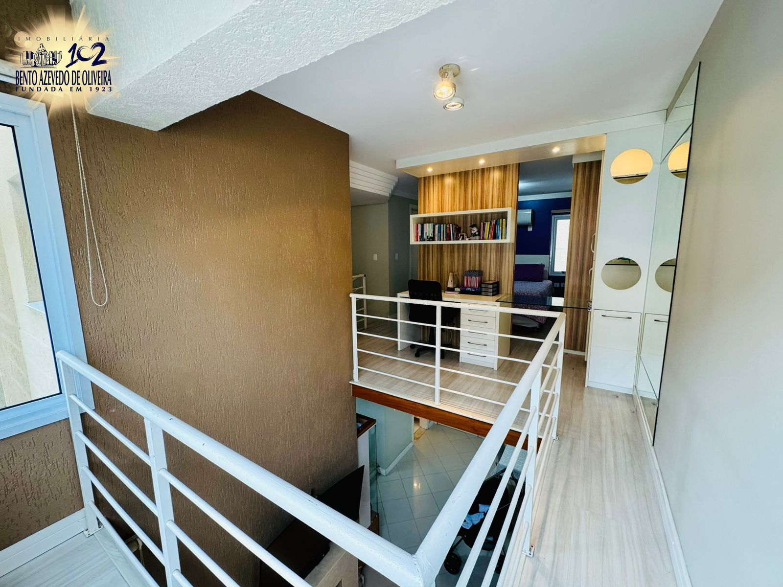 Parte superior, sobre com escada revetida em mármore travertino, possui o dormitório principal com guarda roupa, ar condicionado split de 24.000 Btus, banheiro montado, com espaço home office ja mobiliado com iluminação, o segundo dormitório tem boa versatilidade podendo ser um closet, quarto de visitas ou até mesmo outro home office. Possui duas vagas de garagem lado a lado, depósito individual.