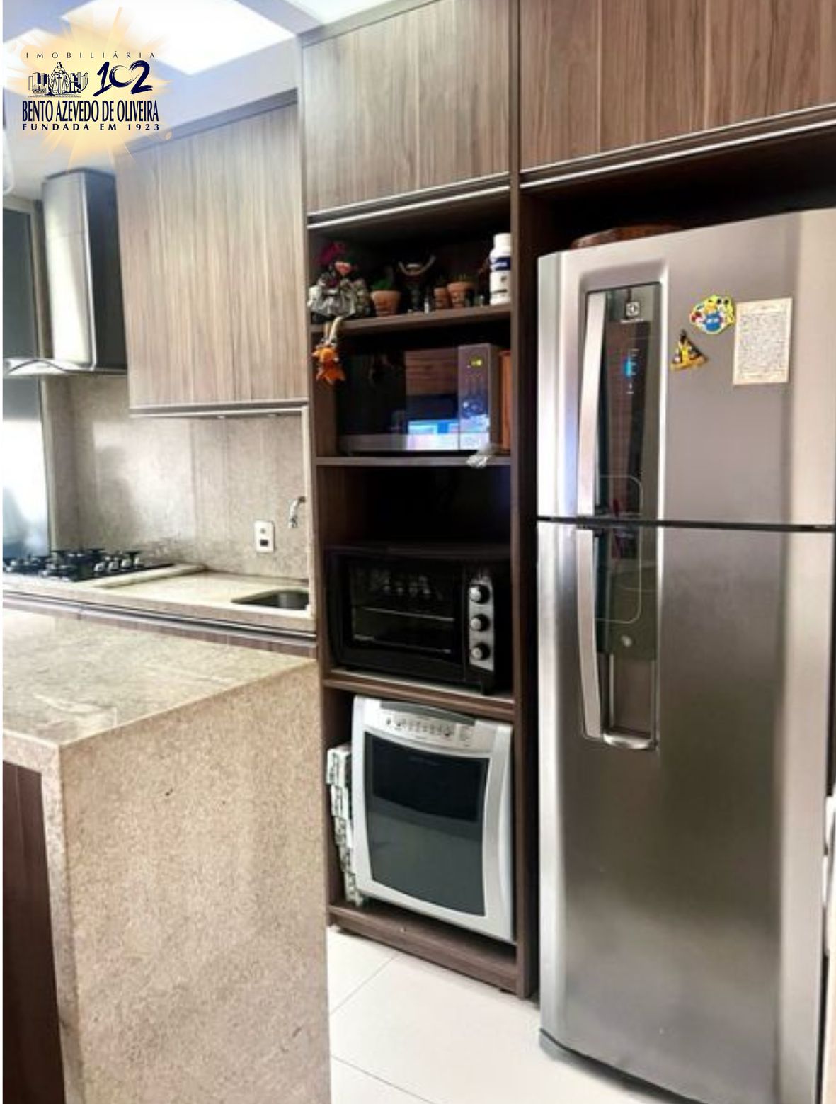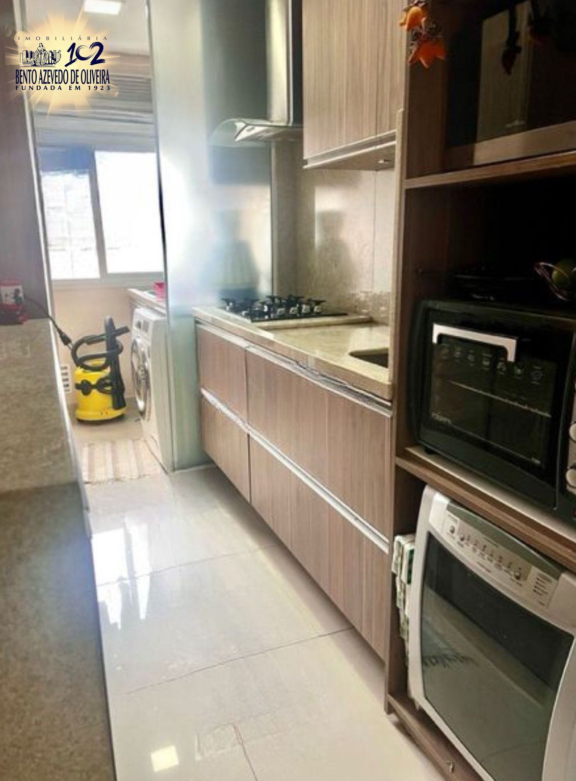 A sala é ampla com ótima vista, proporcionando ótima iluminação e ventilação natural. A sacada, possui churrasqueira, cozinha com móveis planejados, balcão de madeira e piso em porcelanato, Área de serviço integrada com a cozinha.
