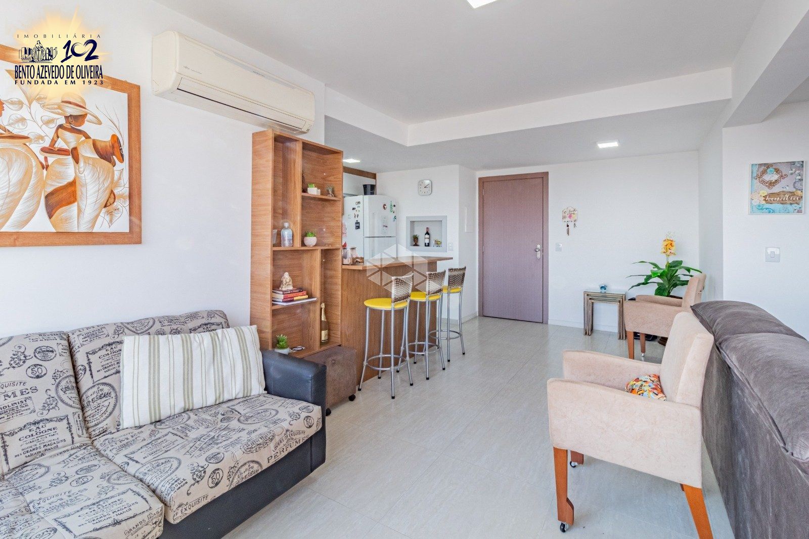 A sala tem 2 ambientes bem definidos, vista linda para o rio Guaíba e split.