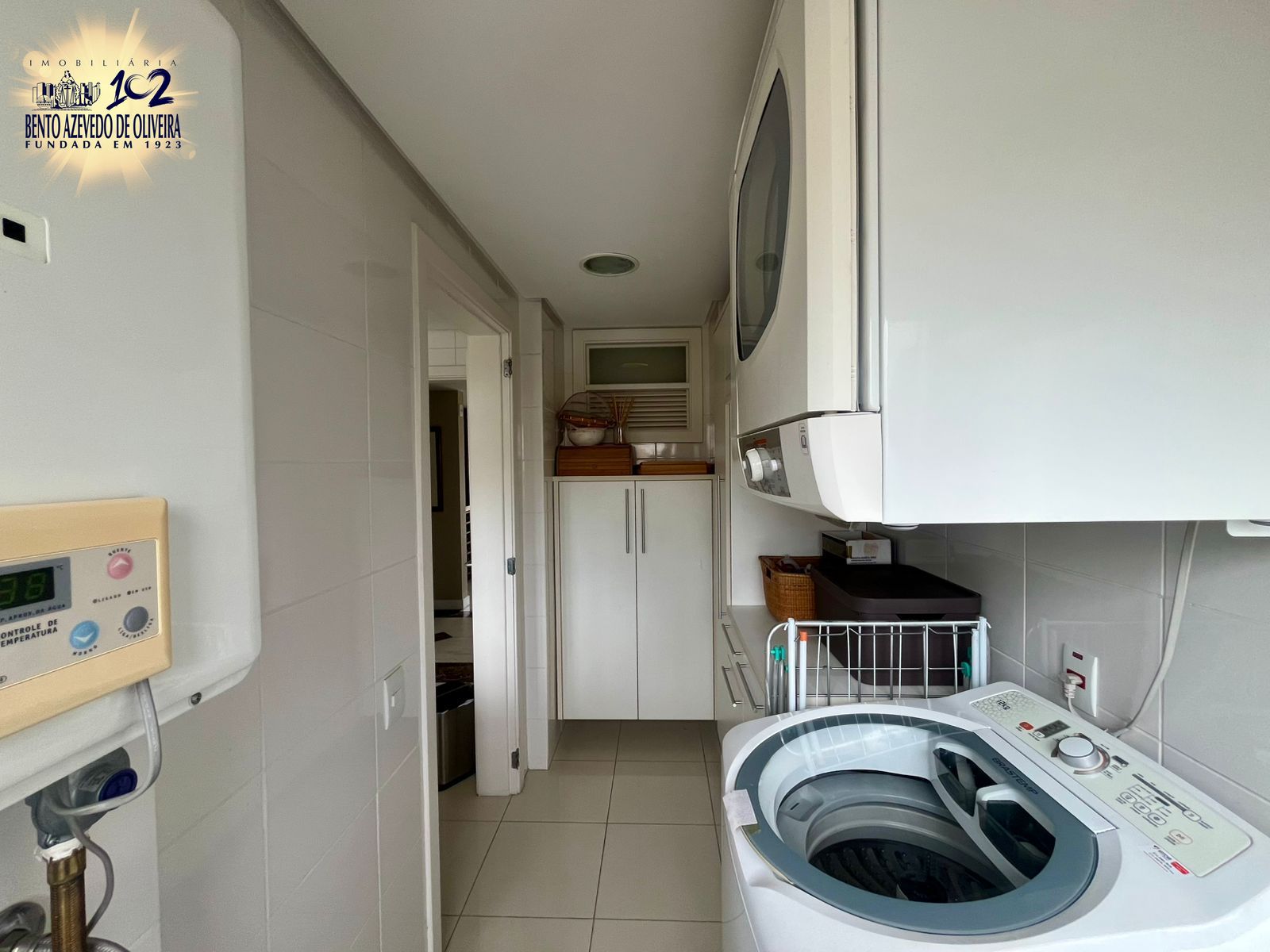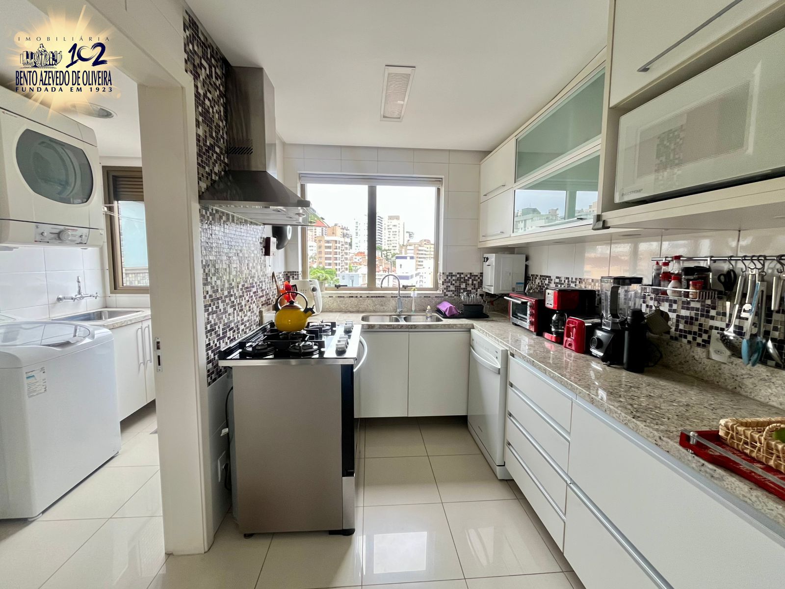 A cozinha é ampla e funcional, equipada com móveis sob medida. A lavanderia é separada e espaçosa, com área para máquinas, varal e junker.