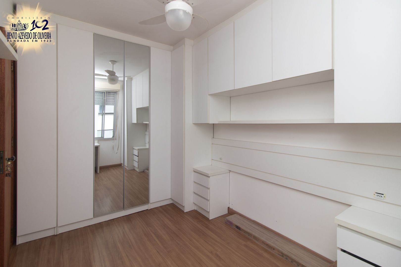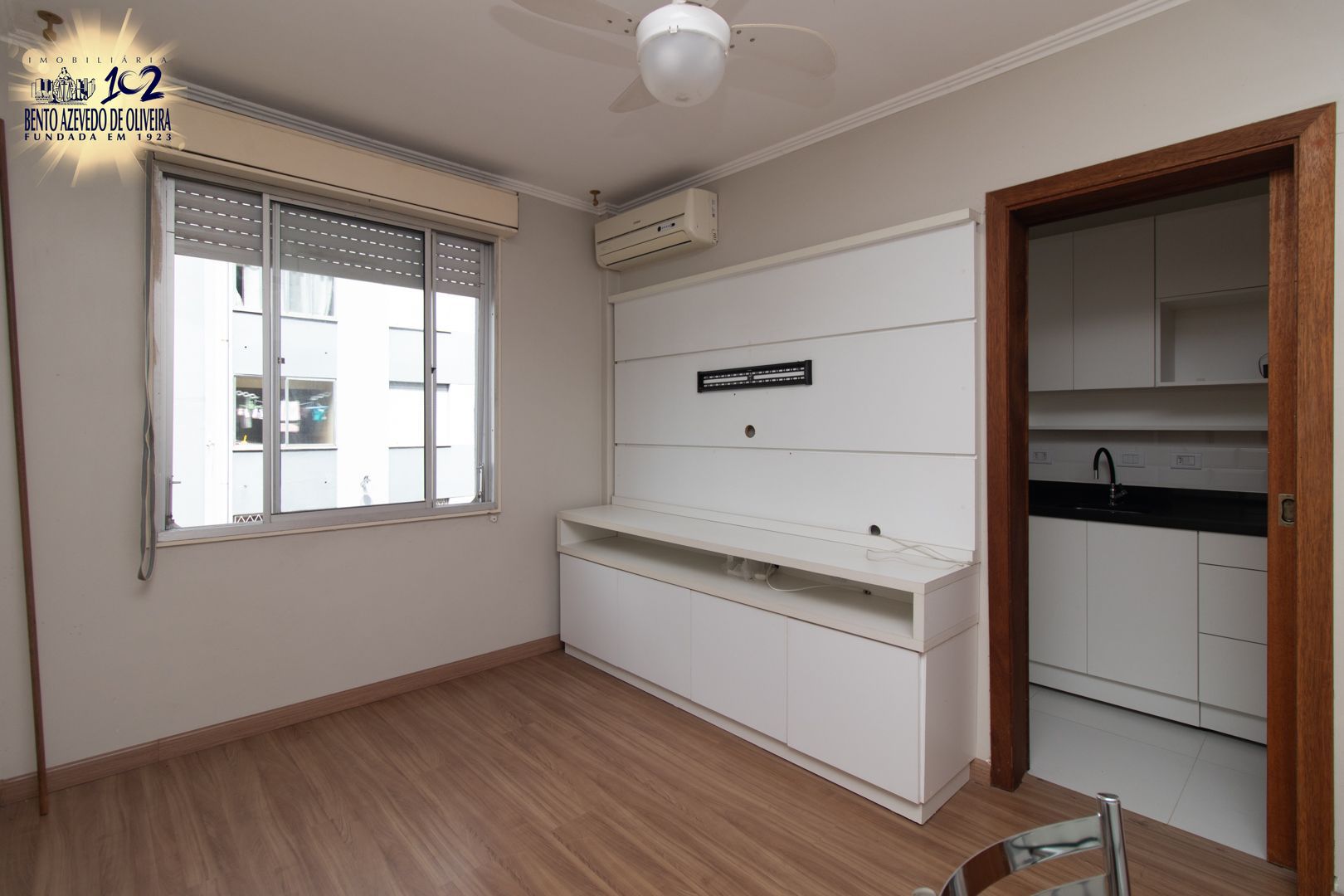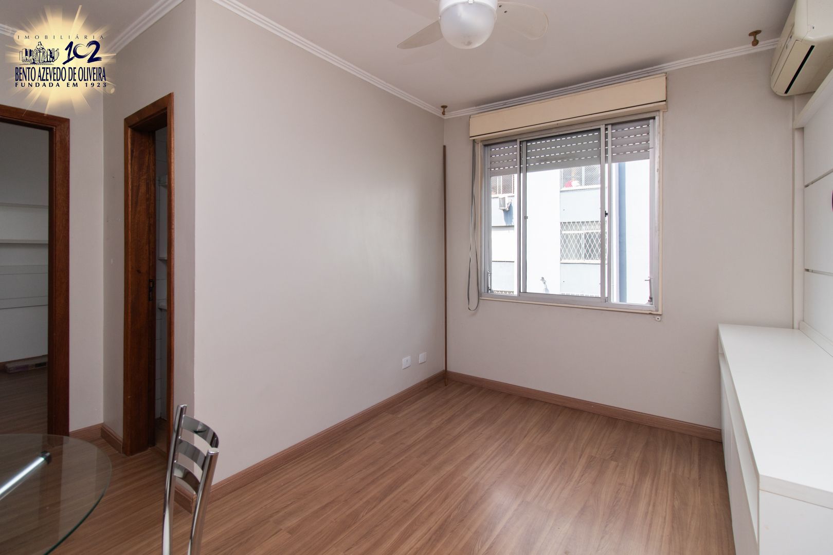 No quarto, os móveis foram projetados para aproveitar cada espaço, incluindo armários, bancada para estudos ou trabalho, painel para TV e cortinas blackout. O banheiro tem ventilação natural e a área de serviço é independente, com varal de teto. O imóvel ainda conta com dois aparelhos de ar-condicionado split e ventiladores de teto, garantindo conforto térmico em todas as estações.