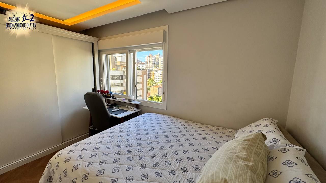 Apartamento semimobiliado de 138 m² com 3 suítes no coração do bairro Rio Branco, a poucos metros do Parcão. O imóvel possui lavabo, living para dois ambientes, lareira e churrasqueira, cozinha planejada, área de serviço independente com banheiro auxiliar, 2 vagas de garagem individuais escrituradas. Finamente decorado e mobiliado por arquiteto. Uma vista espetacular com uma incidência solar fantástica. O condomínio possui infraestrutura completa, quadra de tênis, quadra poliesportiva, piscina térmica, fitness, spa com sauna, sala de jogos e de cinema, portaria presencial.