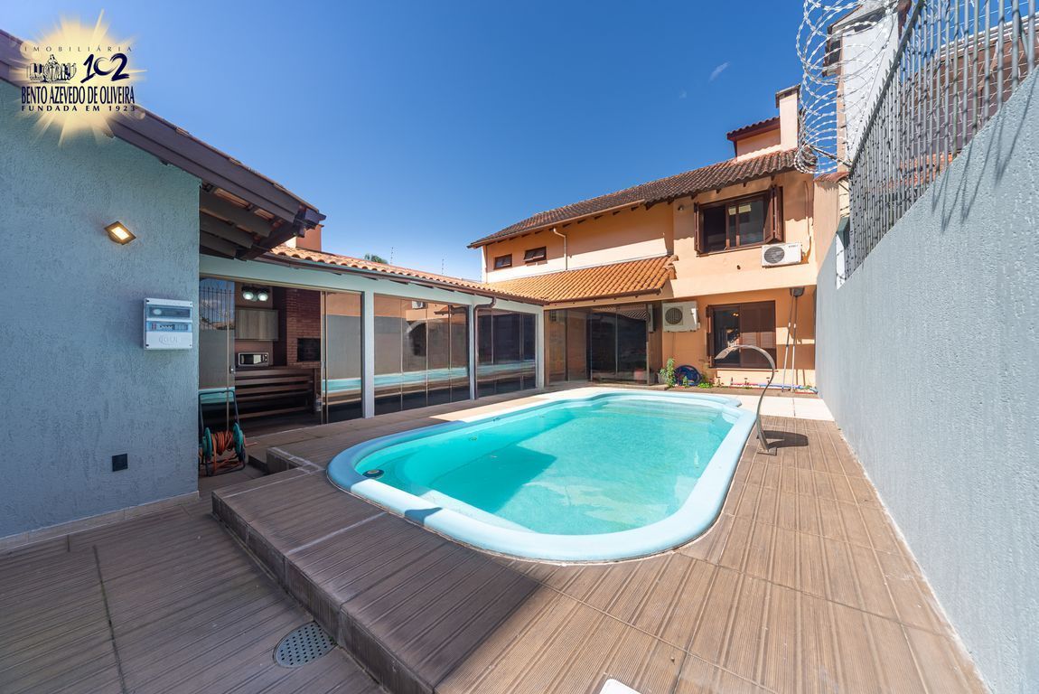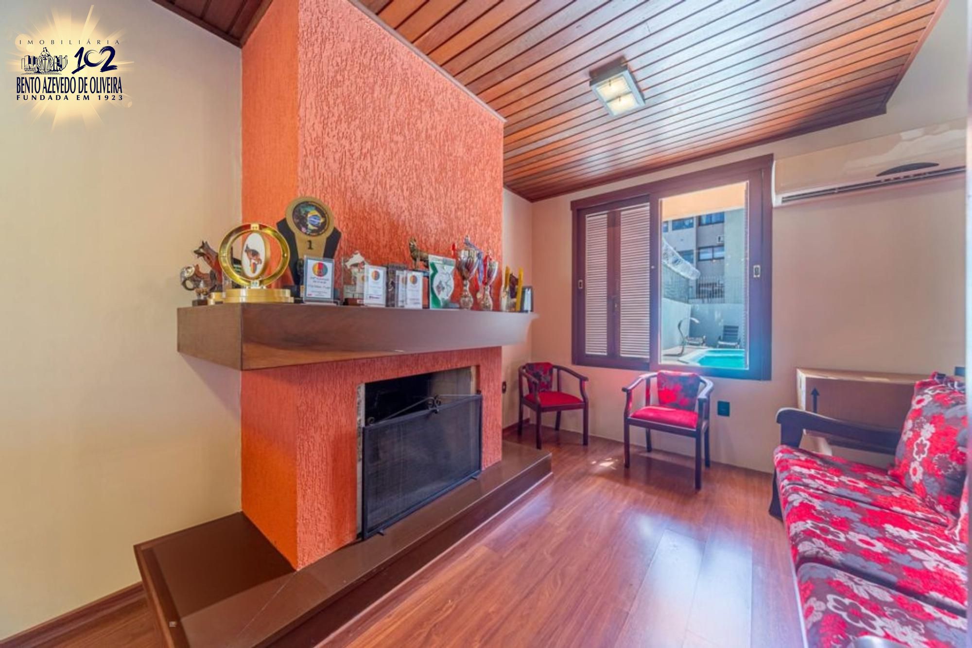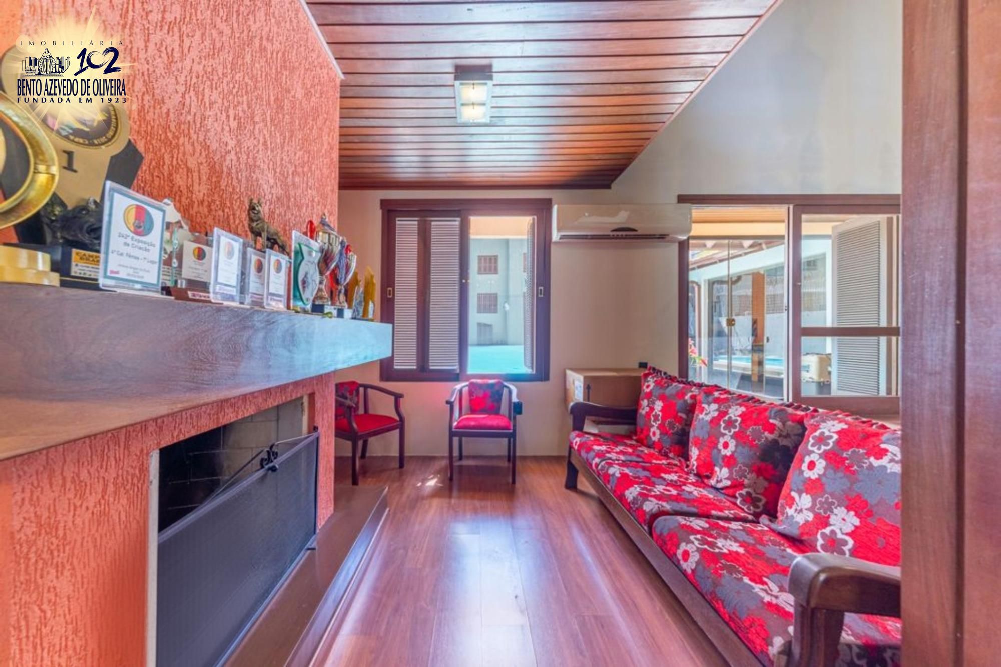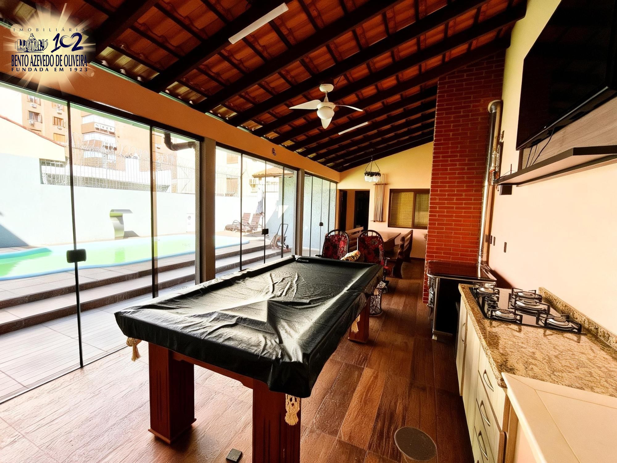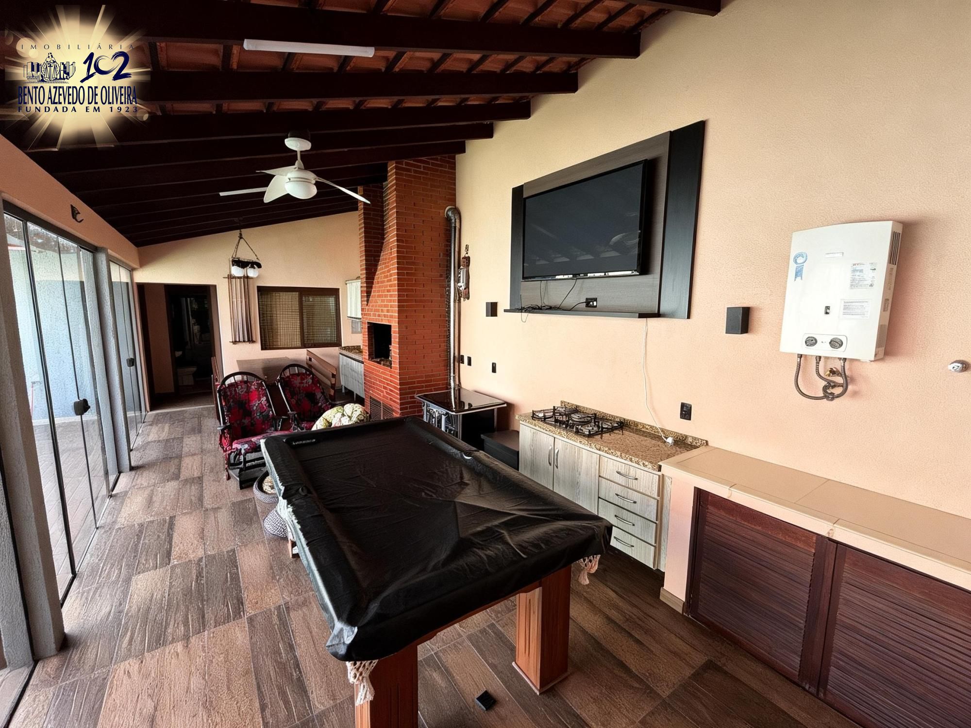 Área gourmet nos fundos com churrasqueira, mesa ampla, pia em mármore, fogão a lenha e mesa de sinuca em ambiente fechado com vidro. Piscina com pátio amplo. Dependência de empregada com possibilidade de uso como canil ou quarto de hóspedes, com ar-condicionado. Banheiro auxiliar com box de vidro e chuveiro elétrico.
