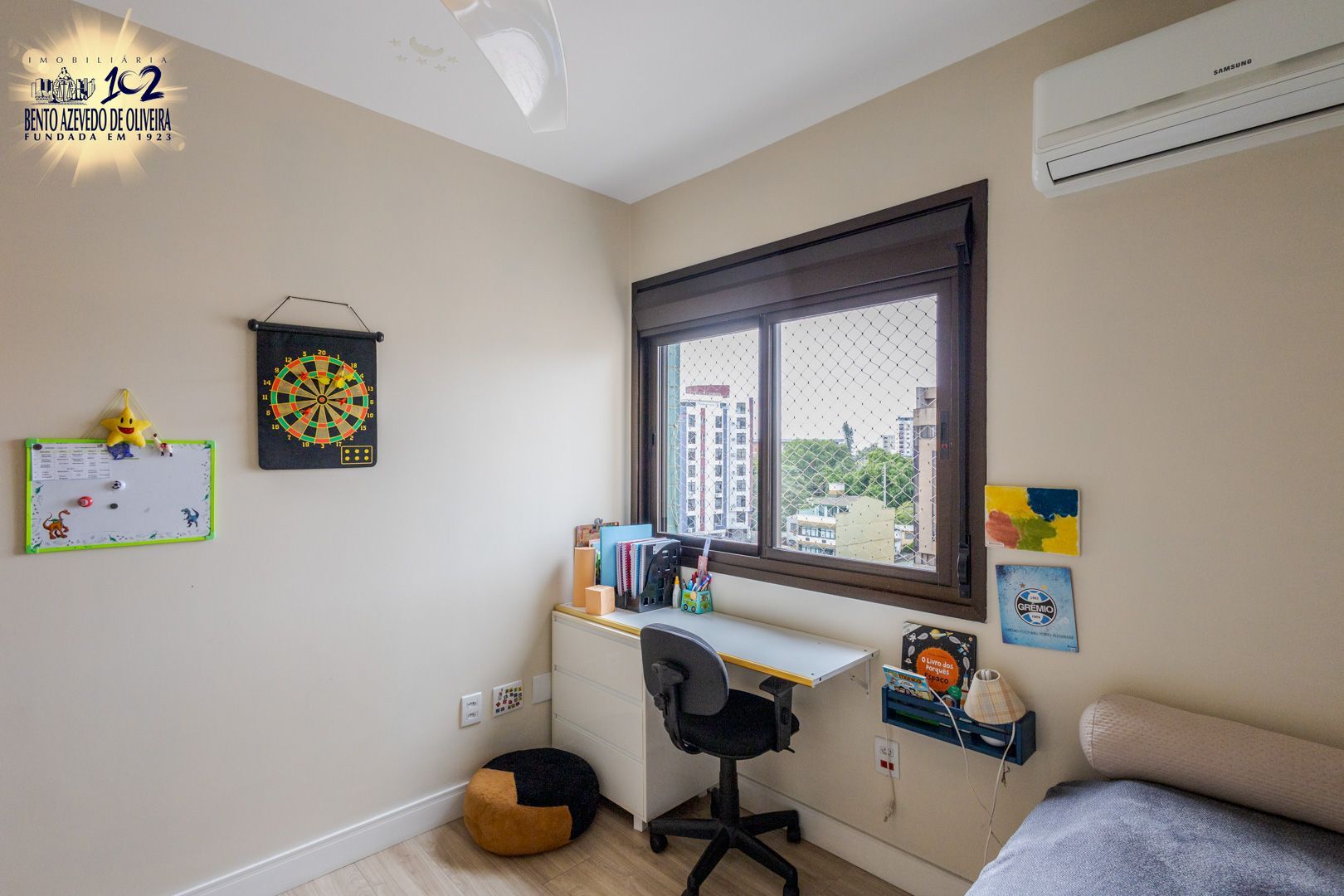 São dois dormitórios, sendo um deles uma suíte com closet e escritório.