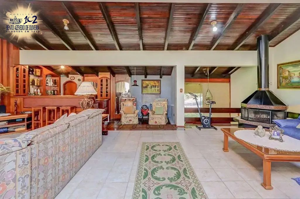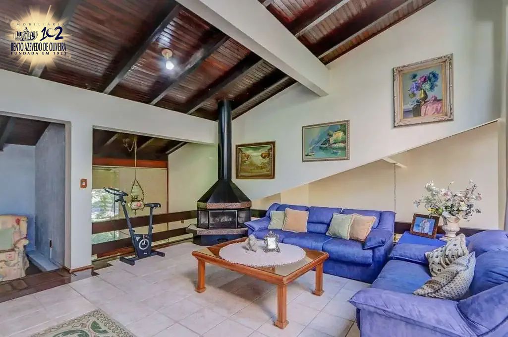 Casa em condomínio, com 481m² de área construída, 3 suítes, lareira, piscina e pátio com pomar.