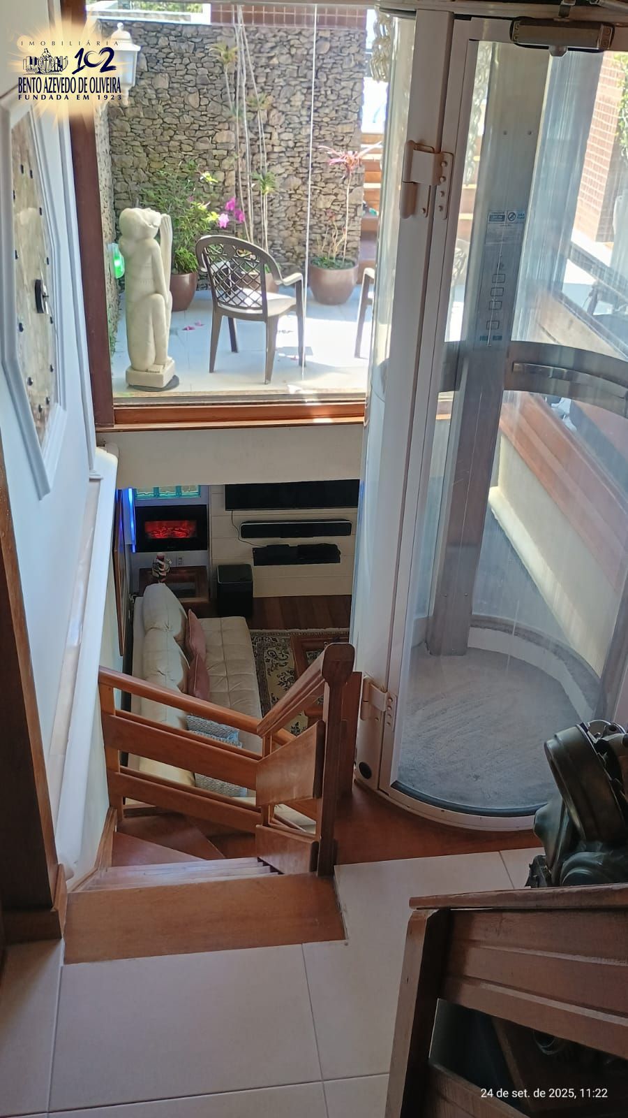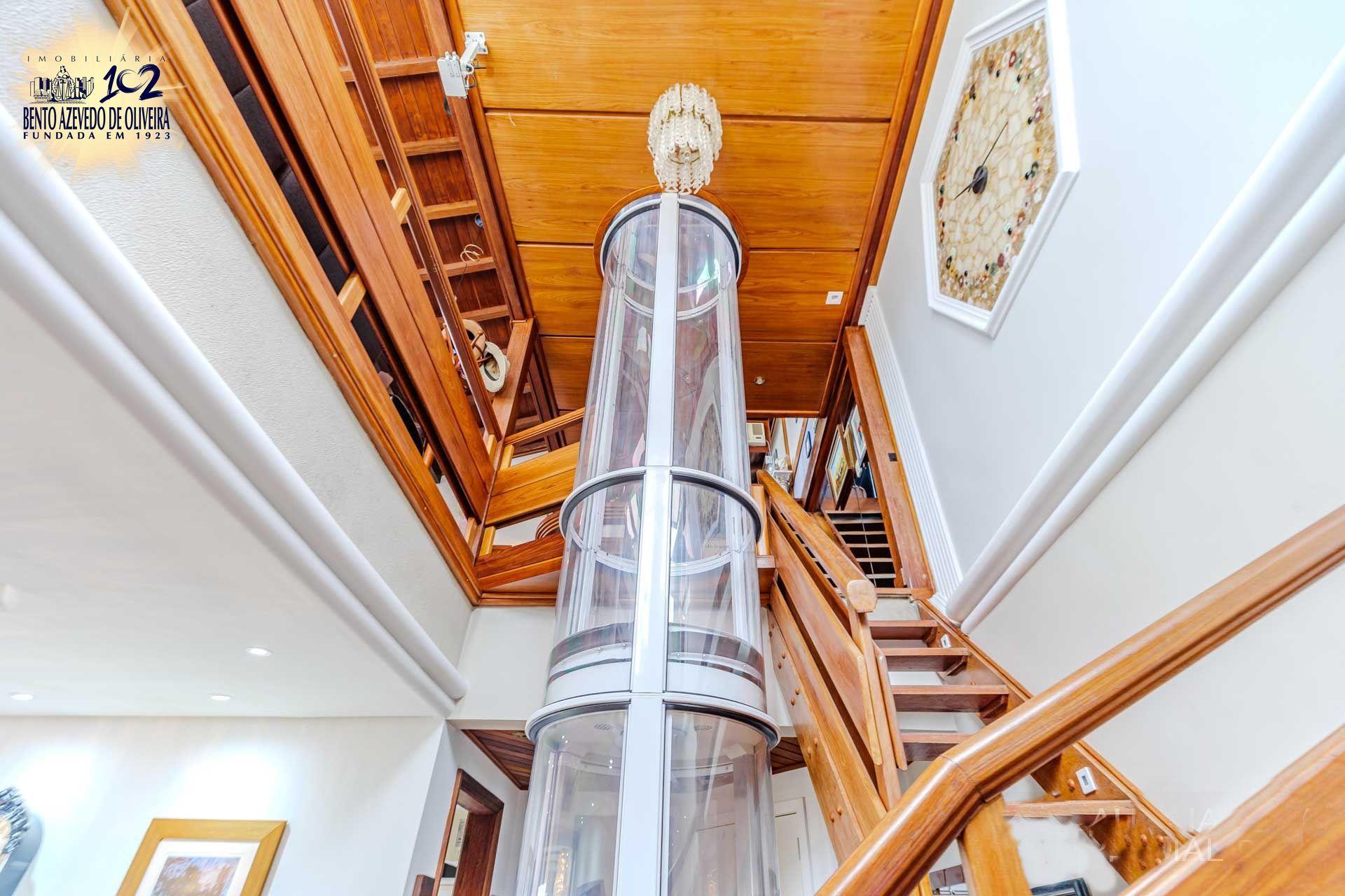 Primeiro pavimento o living com janelas do chão ao teto, 1 suíte masr, 1 dormitório, elevador, janela de tijolo de vidro do poço de luz, lareira ecológica, escadas de madeira com luz de LED, cozinha completa e split, área de serviço com porta auxiliar para o living, mais 1 suíte onde seria a dependência.