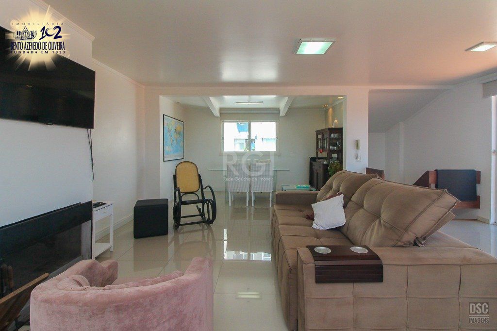 Andar superior: Living 3 ambientes com lareira, churrasqueira, banheiro social e amplo terraço com vista para o Guaíba e pôr do sol.