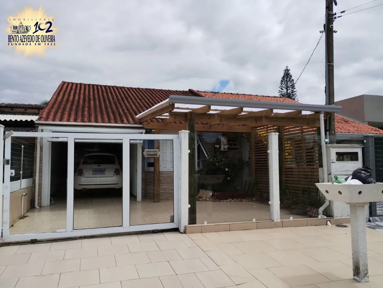 Garagem para dois carros, uma fechada e outra na frente sob o pergolado.
