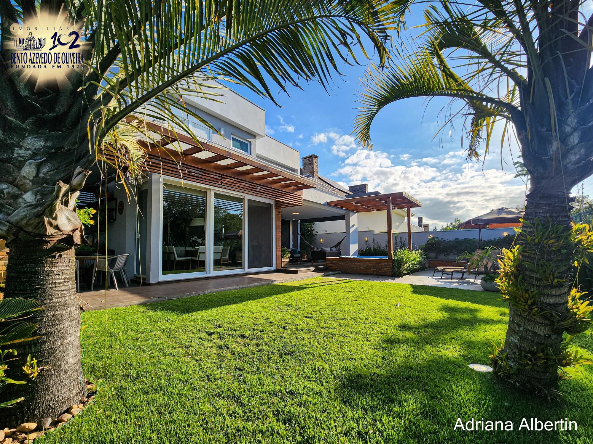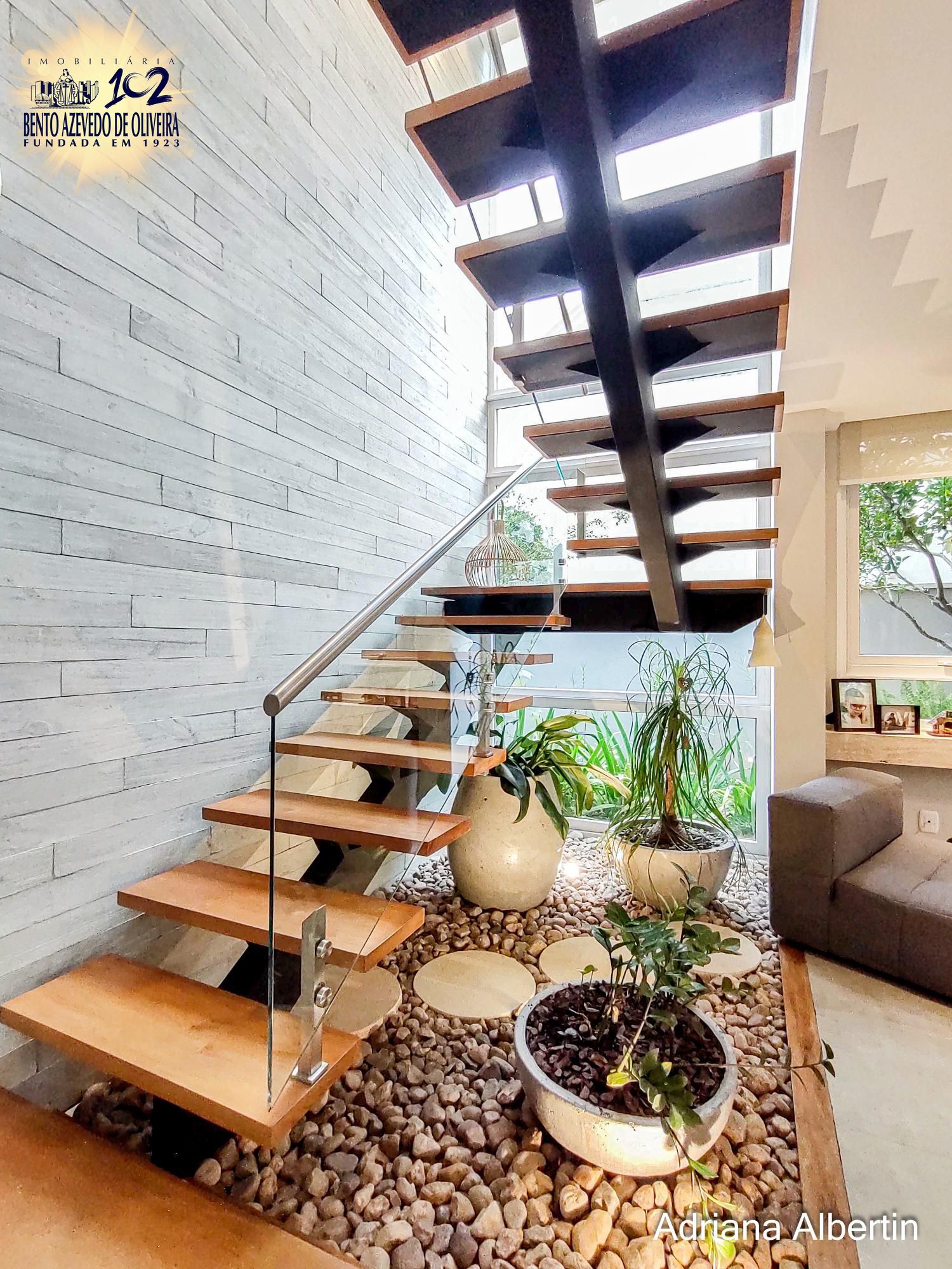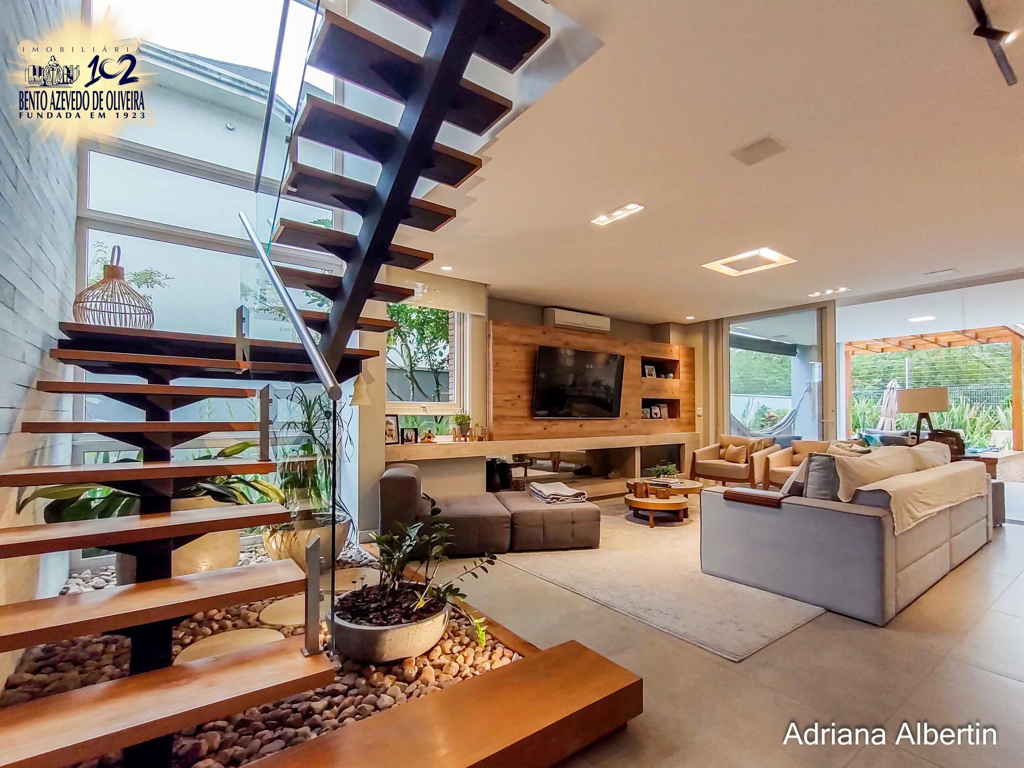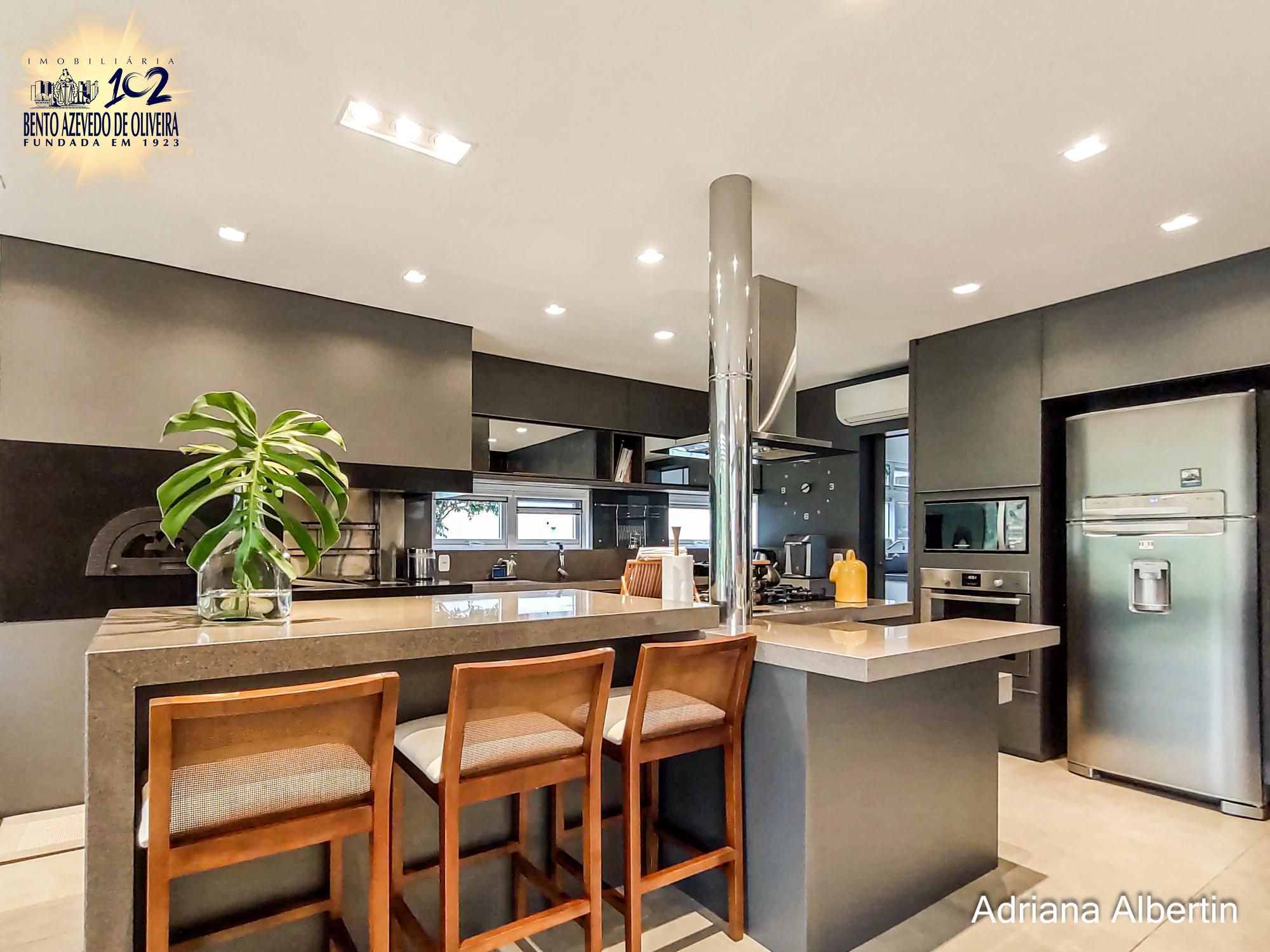 Hall de entrada com pé direito duplo, cortinas automatizadas. Áreas de convívio integradas, living amplo com lareira, jardim de inverno e adega. Cozinha com ilha, fogão á lenha campeiro, parilla e forno de pizza. Lavabo, lavanderia, escritório, pátio com amplos avarandados, spa e espaço gourmet com parilla.