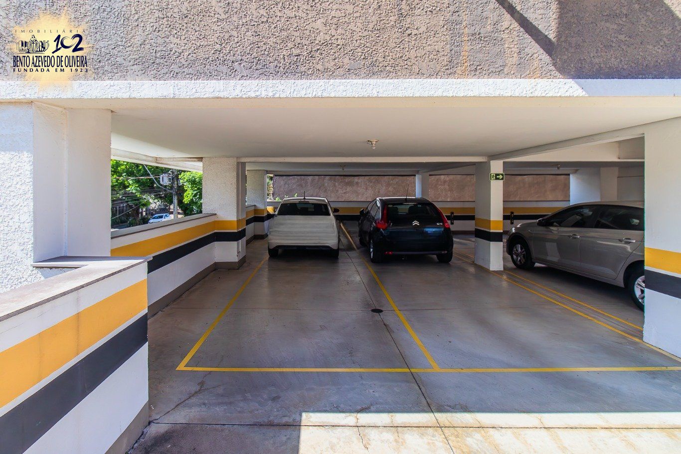 Condomínio com elevador, salão e vaga de garagem coberta tipo box para 2 veículos.