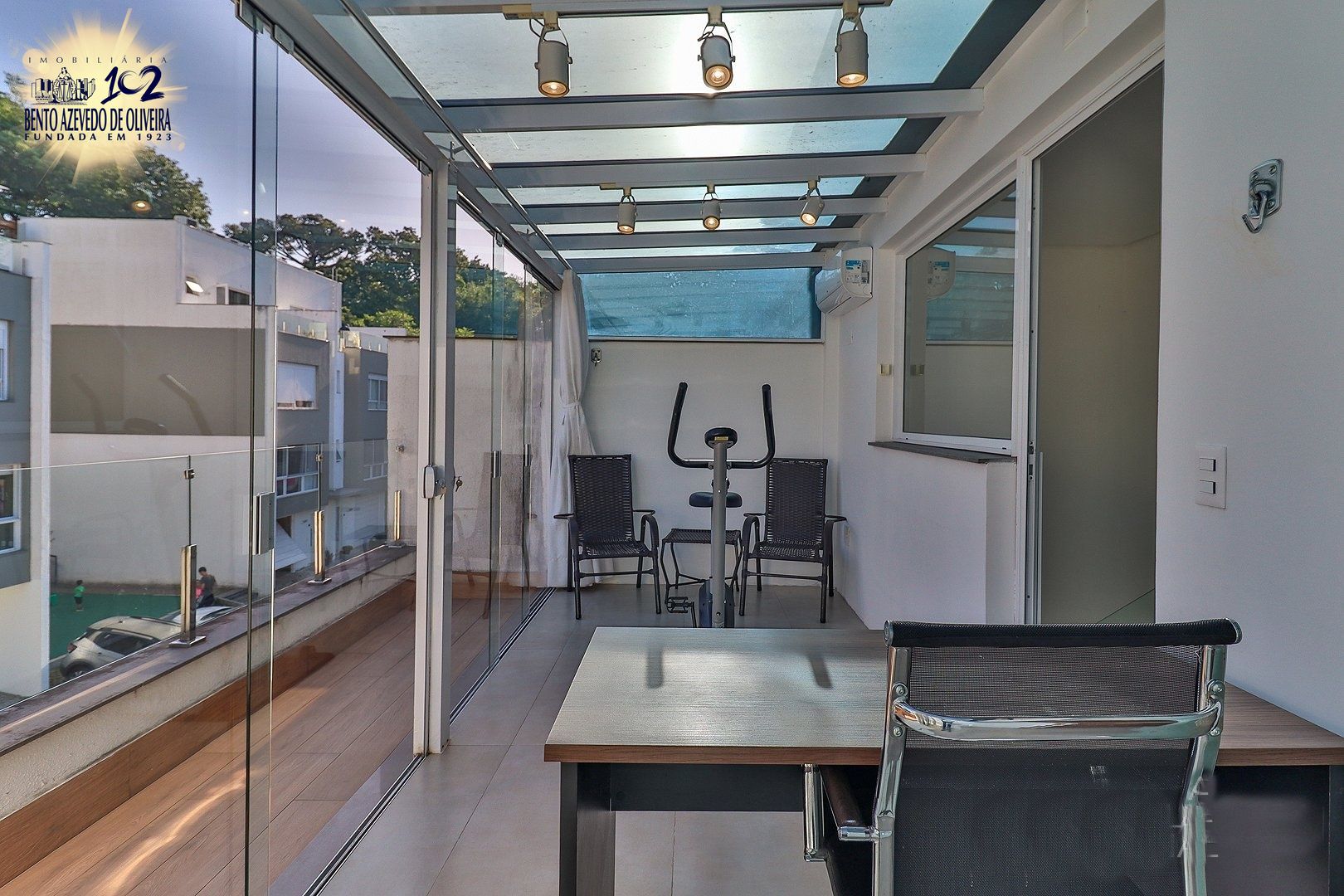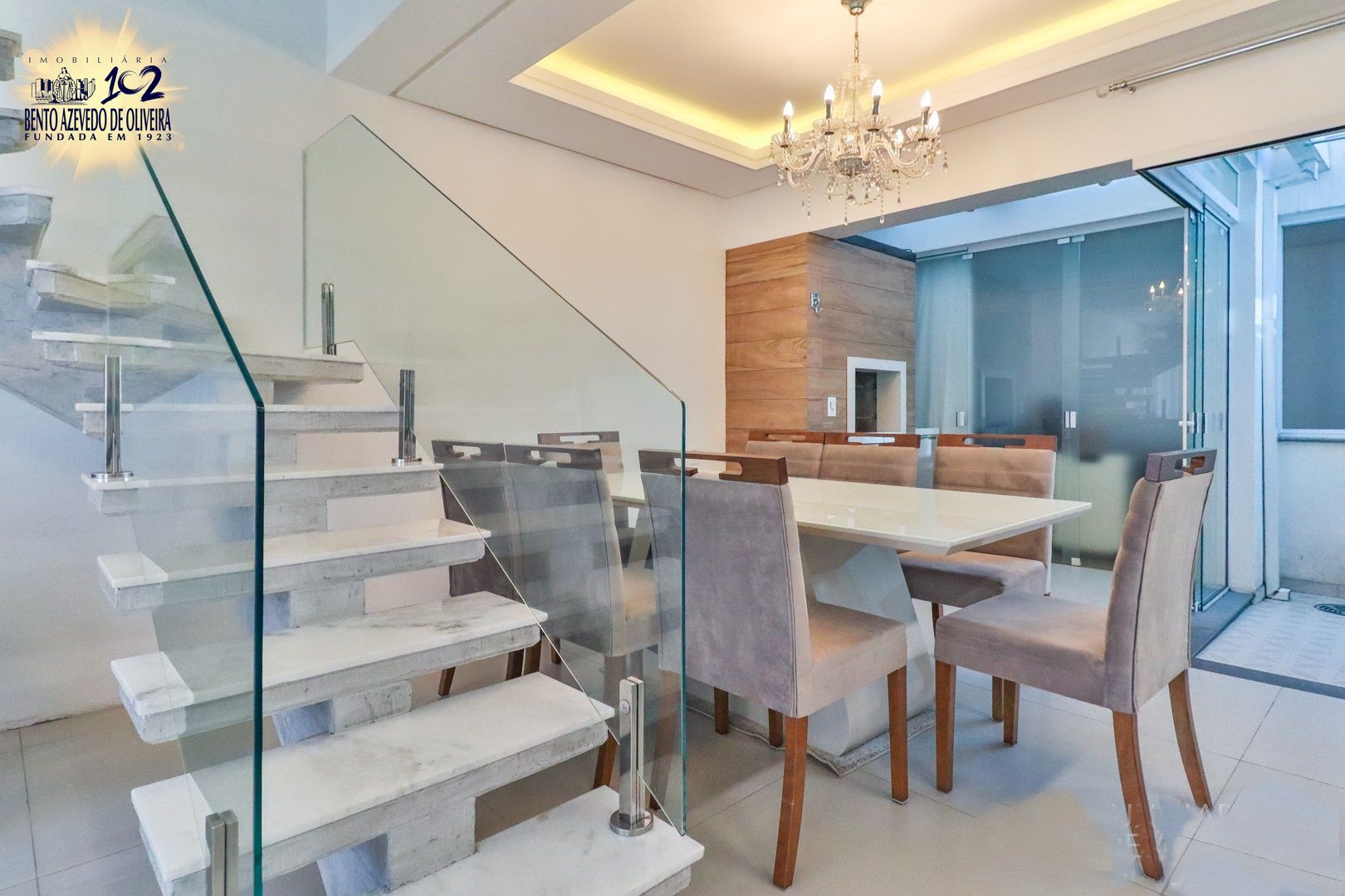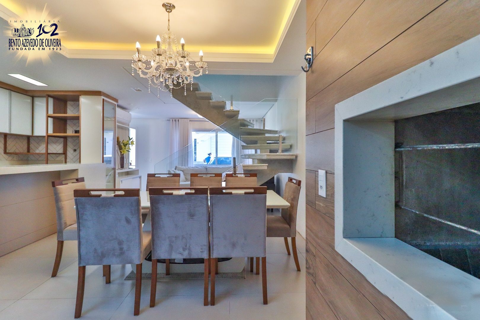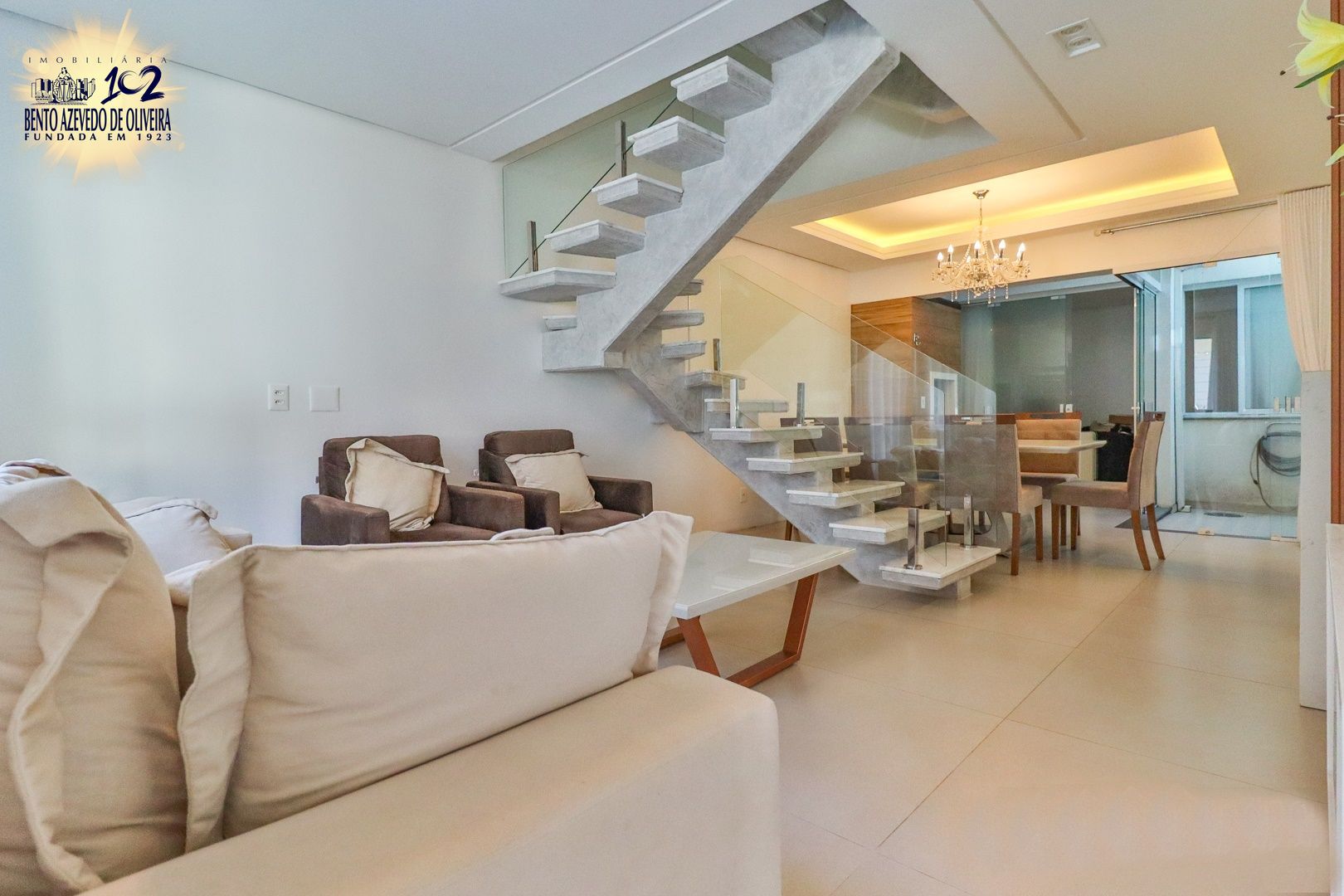 Primeiro pavimento conta com sala de estar, jantar, churrasqueira, lavabo, cozinha, área de serviço com telhado retrátil transparente e a suíte.