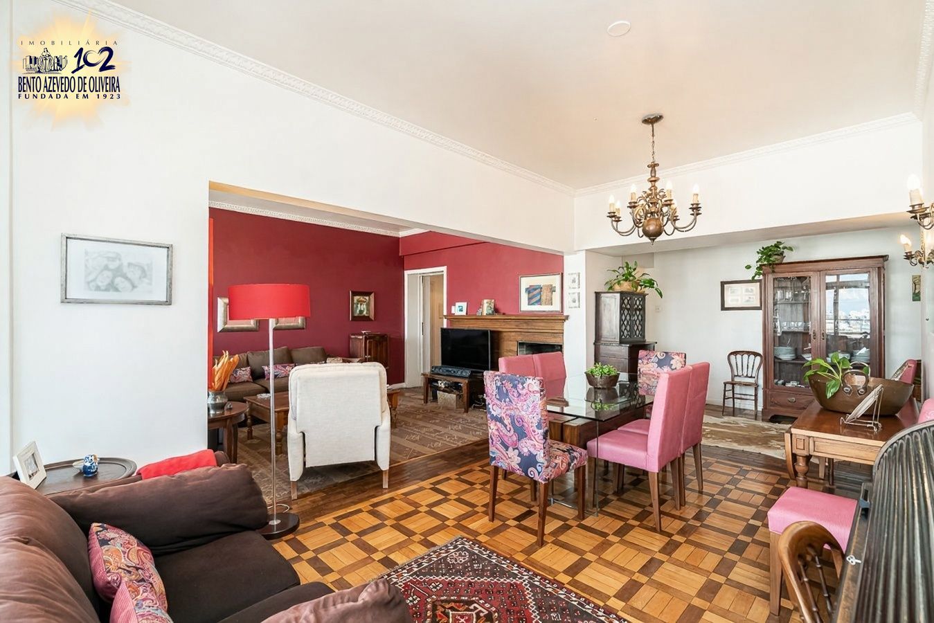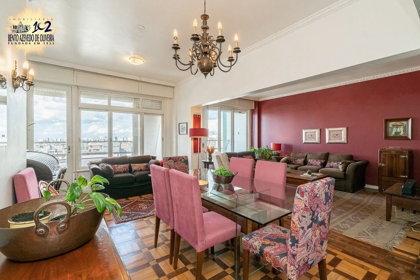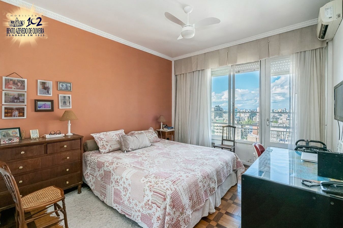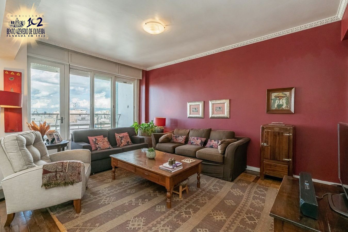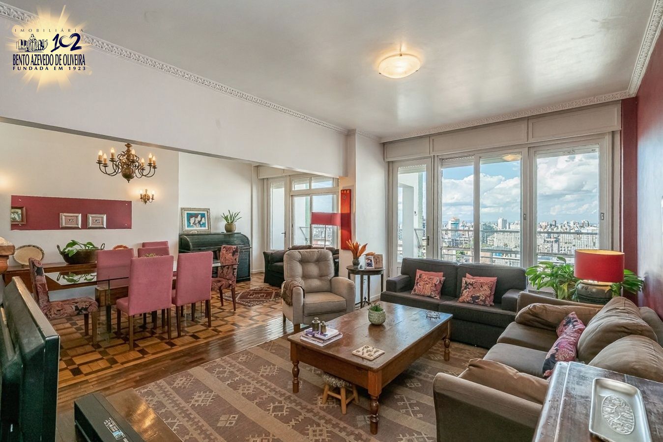 Possui três dormitórios, sendo uma suíte, living amplo para dois ambientes com lareira e sacada voltada para o norte, banheiro social completo, cozinha, área de serviço espaçosa e dependência de empregada com banheiro auxiliar.