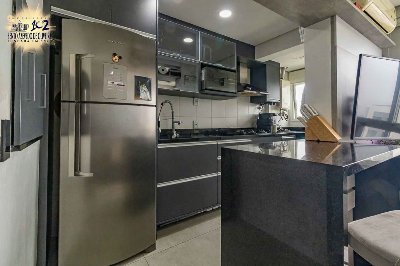 O imóvel possui 2 dormitórios (1 suíte), living para 2 ambientes, cozinha americana com churrasqueira, área de serviço separada e banheiro social. Ficam no imóvel os móveis planejados. Andar alto, bem iluminado, com sol da manhã e vista aberta.